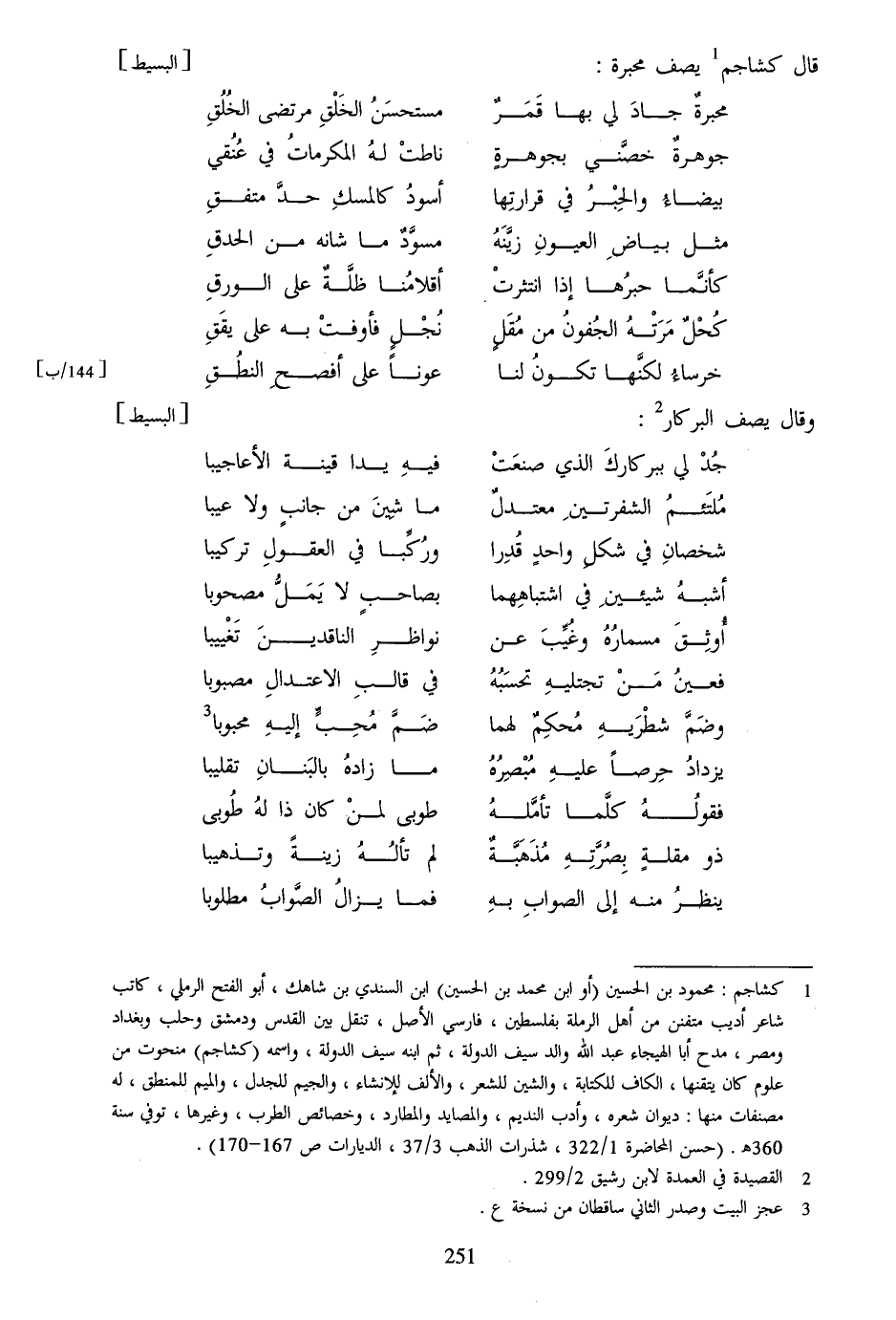 [1] كشاجم: محمود بن الحسين (أو ابن محمد بن الحسين) ابن السندي بن شاهك، أبو الفتح الرملي، كاتب شاعر أديب متفنن من أهل الرملة بفلسطين، فارسي الأصل، تنقل بين القدس ودمشق وحلب وبغداد ومصر، مدح أبا الهيجاء عبد الله والد سيف الدولة، ثم ابنه سيف الدولة، واسمه (كشاجم) منحوت من علوم كان يتقنها، الكاف للكتابة، والشين للشعر، والألف للإنشاء، والجيم للجدل، والميم للمنطق، له مصنفات منها: ديوان شعره، وأدب النديم، والمصايد والمطارد، وخصائص الطرب، وغيرها، توفي سنة.