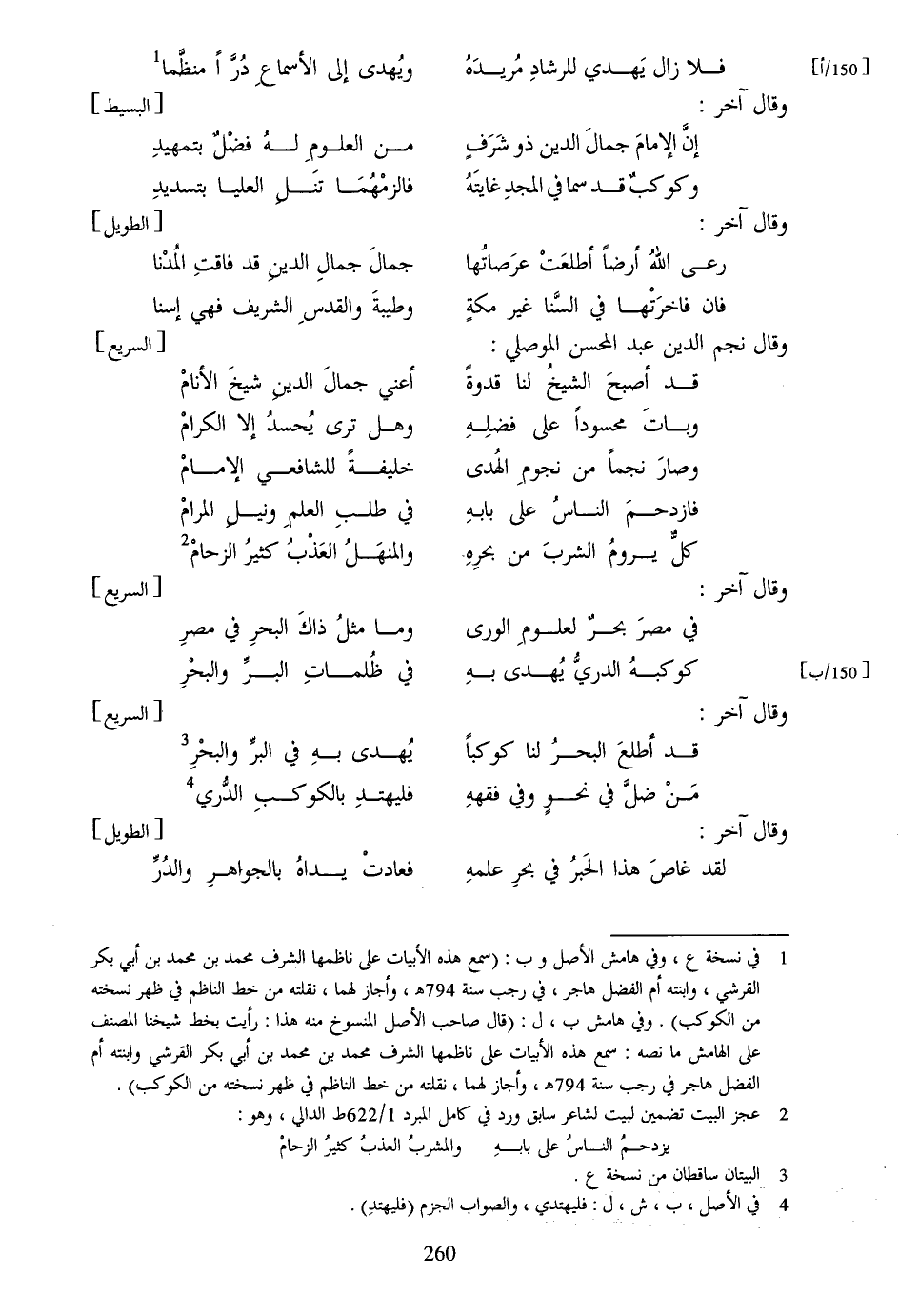 [1] في نسخة ع، وفي هامش الأصل وب: (سمع هذه الأبيات على ناظمها الشرف محمد بن محمد بن أبي بكر القرشي، وابنته أم الفضل هاجر، في رجب سنة 794 هـ، وأجاز لهما، نقلته من خط الناظم في ظهر نسخته من الكوكب) . وفي هامش ب، ل: (قال صاحب الأصل المنسوخ منه هذا: رأيت بخط شيخنا المصنف على الهامش ما نصه: سمع هذه الأبيات على ناظمها الشرف محمد بن محمد بن أبي بكر القرشي وابنته أم الفضل هاجر في رجب سنة 794 هـ، وأجاز لهما، نقلته من خط الناظم في ظهر نسخته من الكوكب) .