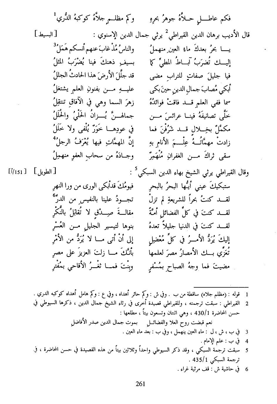 [2] القيراطي: سبقت ترجمته، وللقيراطي قصيدة أخرى في رثاء الشيخ جمال الدين، ذكرها السيوطي في حسن المحاضرة 1/430، وهي اثنتان وتسعون بيتا، مطلعها: