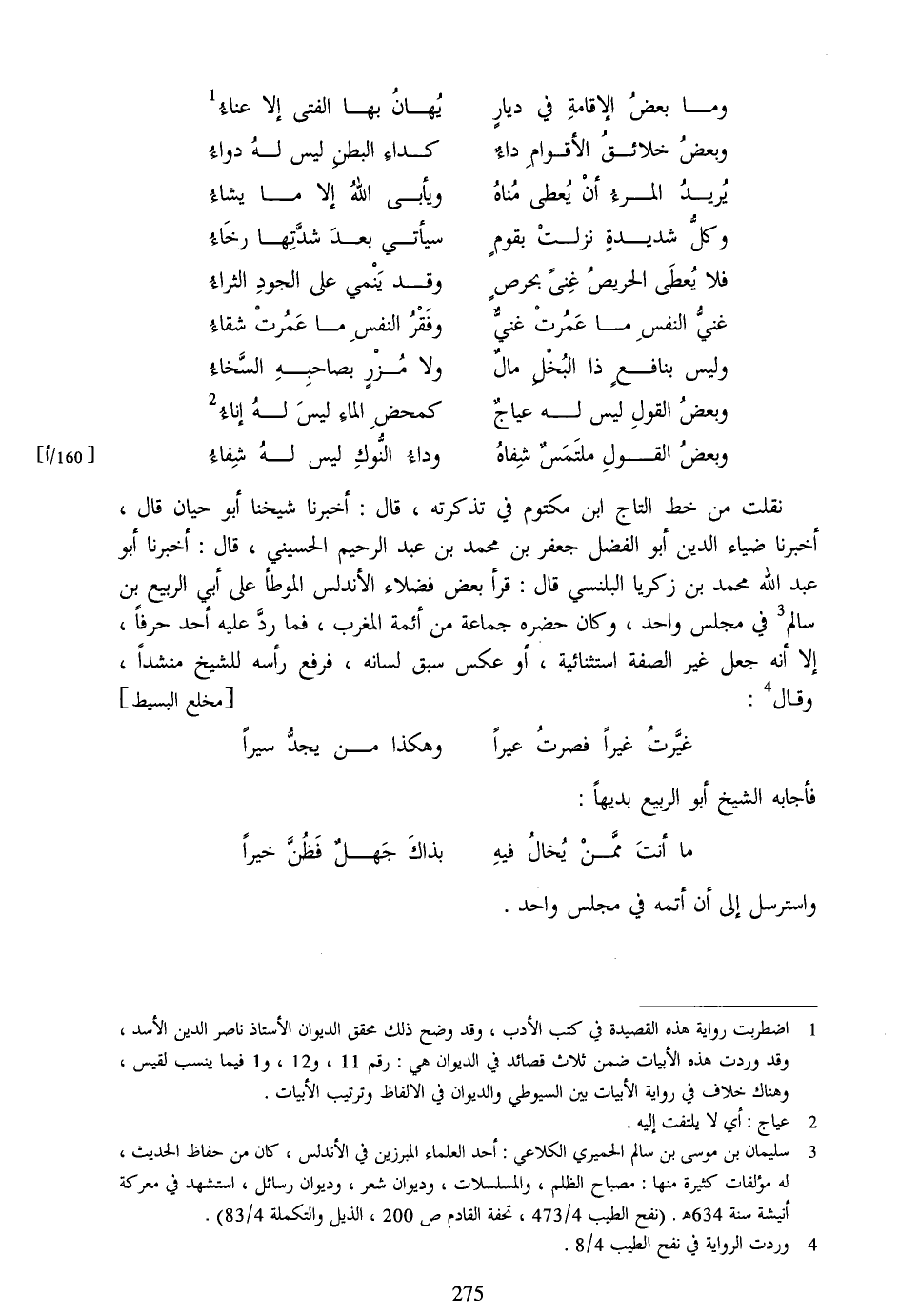 نقلت من خط التاج ابن مكتوم في تذكرته، قال: أخبرنا شيخنا أبو حيان قال، أخبرنا ضياء الدين أبو الفضل جعفر بن محمد بن عبد الرحيم الحسيني، قال: أخبرنا أبو عبد الله محمد بن زكريا البلنسي قال: قرأ بعض فضلاء الأندلس الموطأ على أبي الربيع بن سالم [3] في مجلس واحد، وكان حضره جماعة من أئمة المغرب، فما ردّ عليه أحد حرفا، إلا أنه جعل غير الصفة استثنائية، أو عكس سبق لسانه، فرفع رأسه للشيخ منشدا، وقال [4] : [مخلع البسيط]