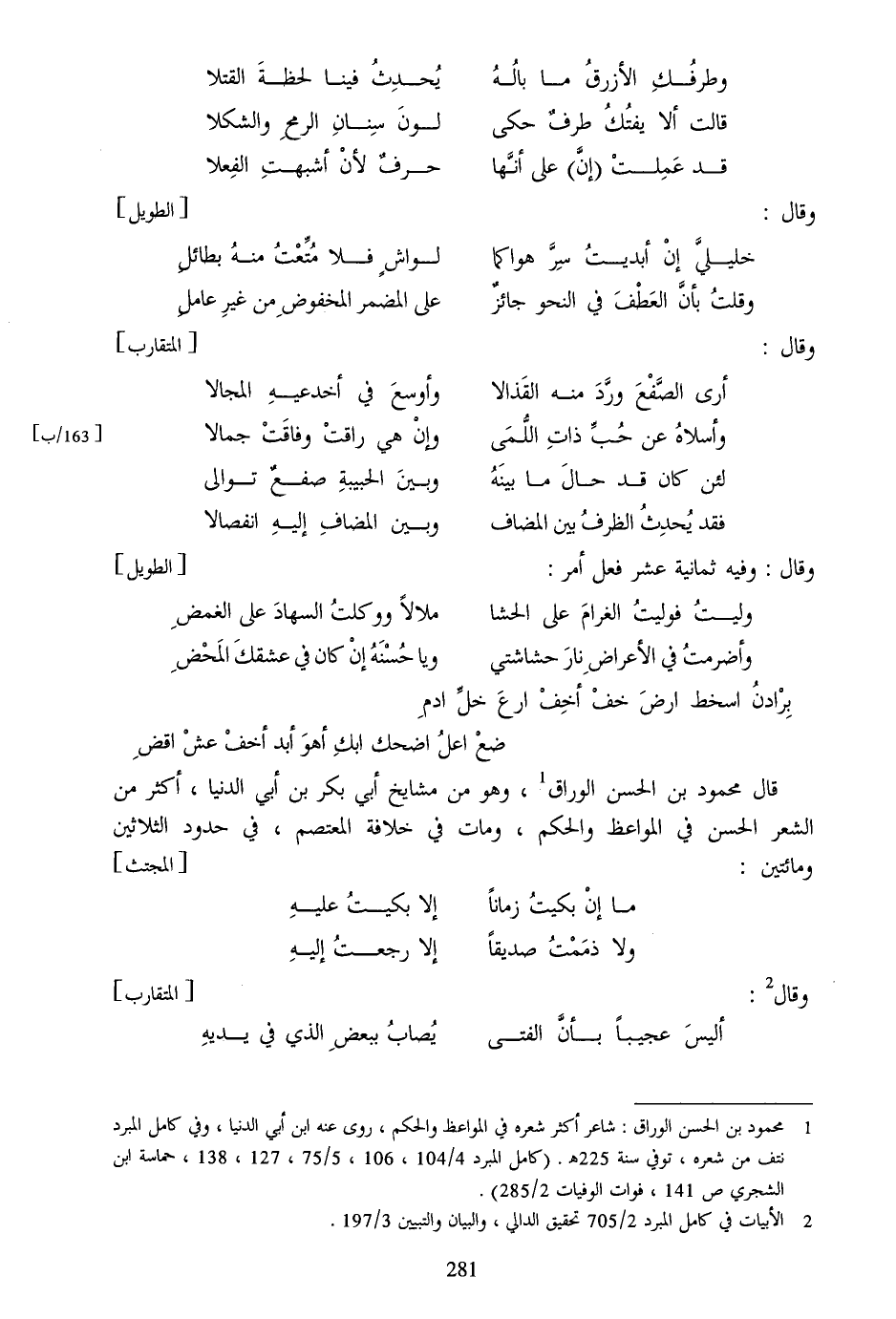 [1] محمود بن الحسن الوراق: شاعر أكثر شعره في المواعظ والحكم، روى عنه ابن أبي الدنيا، وفي كامل المبرد نتف من شعره، توفي سنة 225 هـ. (كامل المبرد 4/104، 106، 5/75، 127، 138، حماسة ابن الشجري ص 141، فوات الوفيات 2/285) .