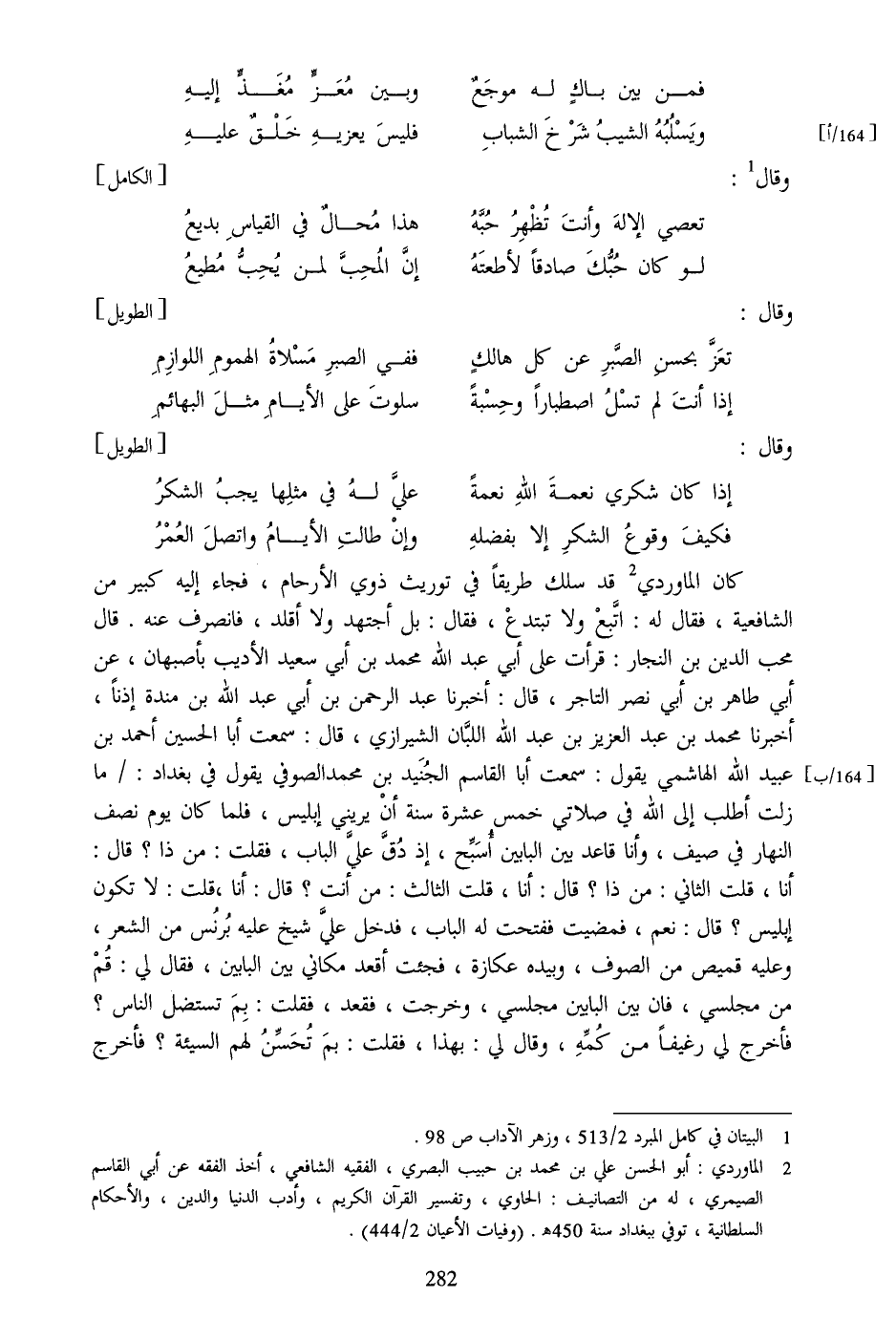 كان الماوردي [2] قد سلك طريقا في توريث ذوي الأرحام، فجاء إليه كبير من الشافعية، فقال له: اتّبع ولا تبتدع، فقال: بل أجتهد ولا أقلد، فانصرف عنه. قال محب الدين بن النجار: قرأت على أبي عبد الله محمد بن أبي سعيد الأديب بأصبهان، عن أبي طاهر بن أبي نصر التاجر، قال: أخبرنا عبد الرحمن بن أبي عبد الله بن مندة إذنا، أخبرنا محمد بن عبد العزيز بن عبد الله اللبّان الشيرازي، قال: سمعت أبا الحسين أحمد بن عبيد الله الهاشمي يقول: سمعت أبا القاسم الجنيد بن محمد الصوفي يقول في بغداد:/ ما زلت أطلب إلى الله في صلاتي خمس عشرة سنة أن يريني إبليس، فلما كان يوم نصف النهار في صيف، وأنا قاعد بين البابين أسبّح، إذ دقّ عليّ الباب، فقلت: من ذا؟ قال: