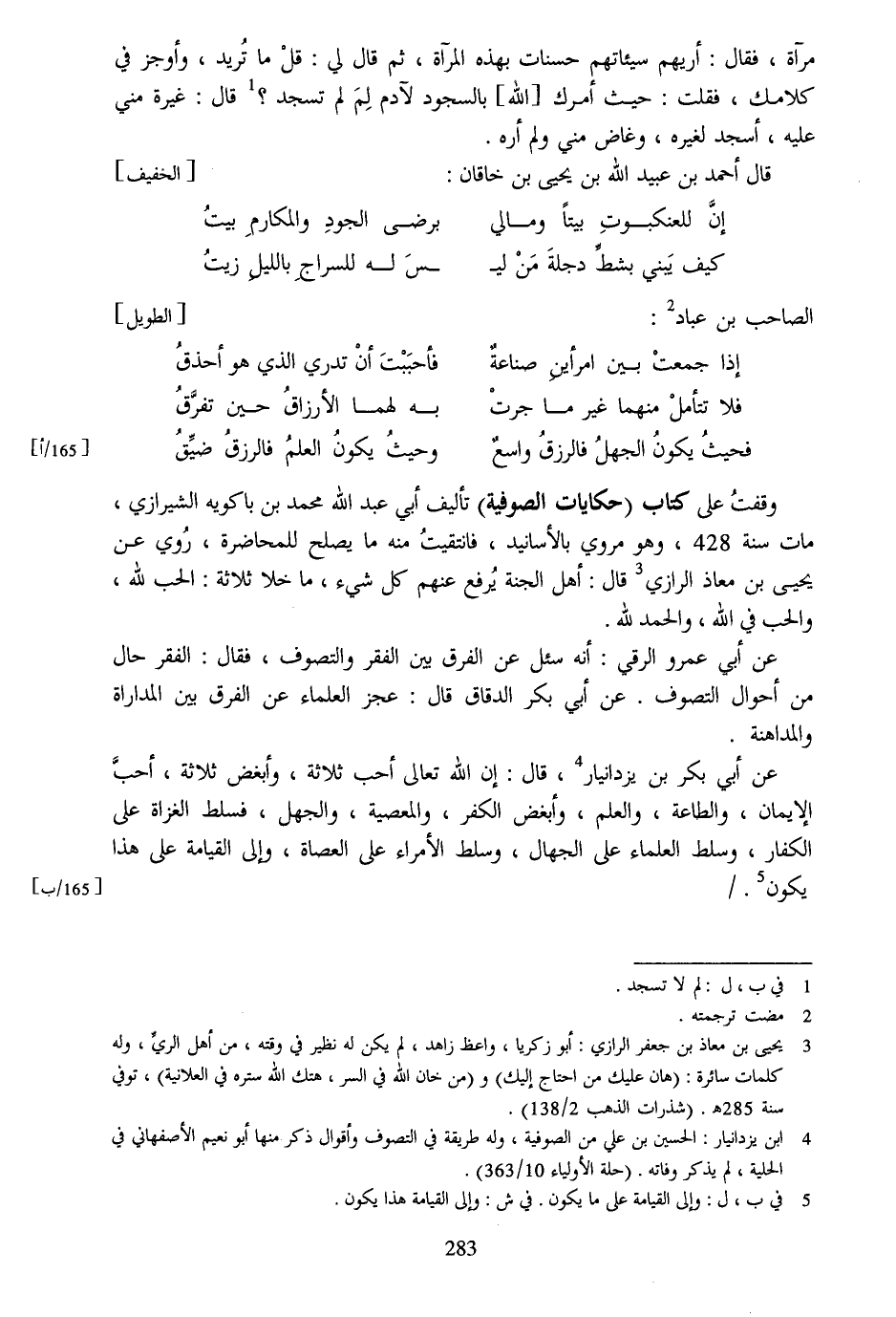 وقفت على كتاب (حكايات الصوفية) تأليف أبي عبد الله محمد بن باكويه الشيرازي، مات سنة 428، وهو مروي بالأسانيد، فانتقيت منه ما يصلح للمحاضرة، روي عن يحيى بن معاذ الرازي [3] قال: أهل الجنة يرفع عنهم كل شيء، ما خلا ثلاثة: الحب لله، والحب في الله، والحمد لله.