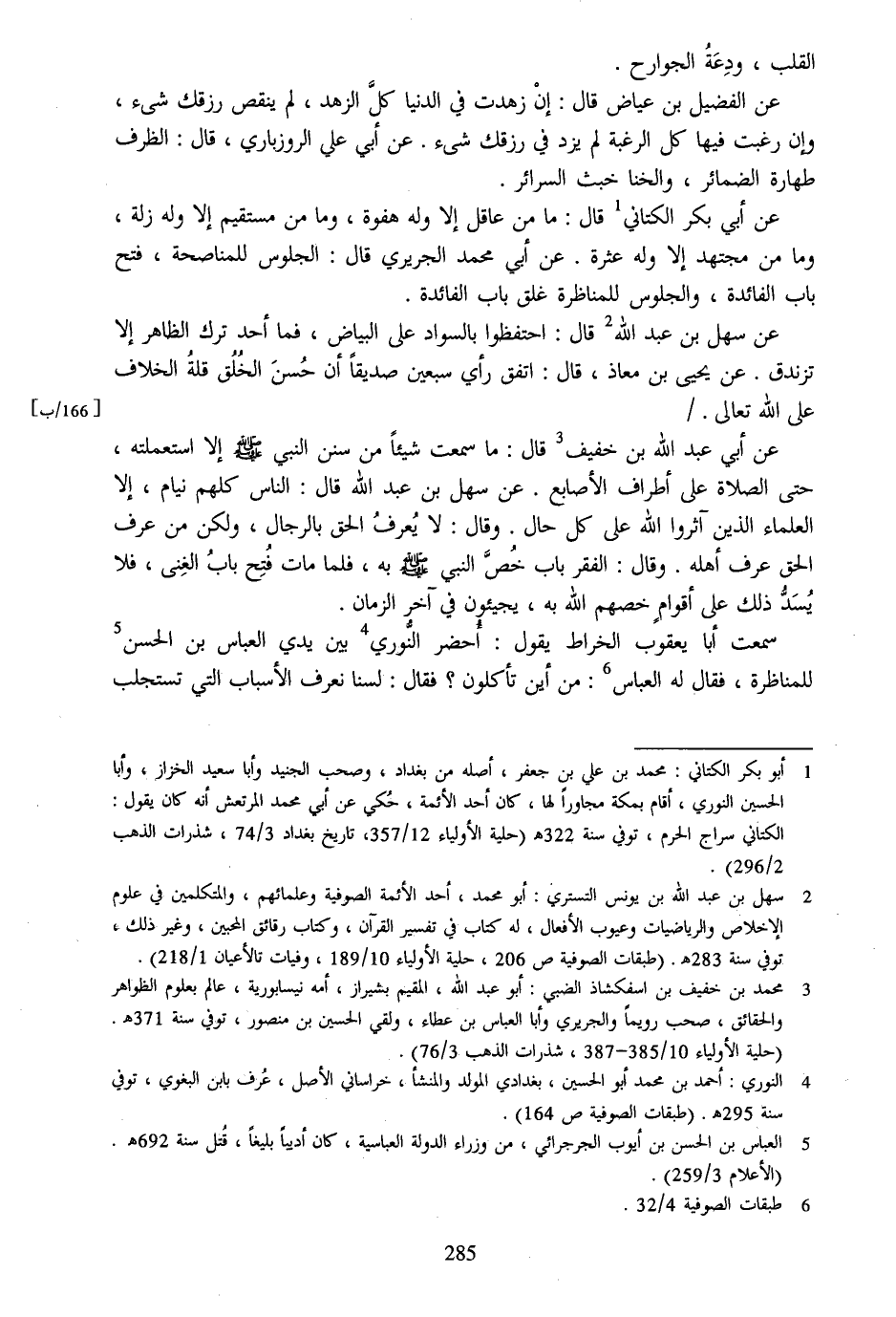[4] النوري: أحمد بن محمد أبو الحسين، بغدادي المولد والمنشأ، خراساني الأصل، عرف بابن البغوي، توفي سنة 295 هـ. (طبقات الصوفية ص 164) .