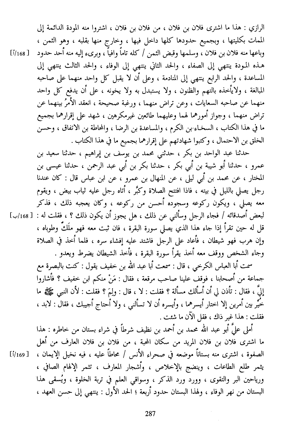 الرازي: هذا ما اشترى فلان بن فلان، من فلان بن فلان، اشتروا منه المودة الدائمة إلى الممات بكليتها، وبجميع حدودها كلها داخل فيها، وخارج منها بقلبه، وهو الثمن، وباعها منه فلان بن فلان، وسلمها وقبض الثمن/ كله تاما وافيا، وبرىء إليه منه أحد حدود هذه المودة ينتهي إلى الصفاء، والحد الثاني ينتهي إلى الوفاء، والحد الثالث ينتهي إلى المساعدة، والحد الرابع ينتهي إلى المنادمة، وعلى أن لا يقبل كل واحد منهما على صاحبه المبالغة، ولا يأخذه بالتهم والظنون، ولا يستبدل به ولا يخونه، على أن يدفع كل واحد منهما عن صاحبه السعايات، وعن تراض منهما، ورغبة صحيحة، انعقد الأمر بينهما عن تراض منهما، وجواز أمورهما لهما وعليهما طائعين غير مكرهين، شهد على إقرارهما بجميع ما في هذا الكتاب، السخاء بن الكرم، والمساعدة بن الرضا، والمحاطة بن الاتفاق، وحسن الخلق بن الاحتمال، وكتبوا شهادتهم على إقرارهما بجميع ما في هذا الكتاب.