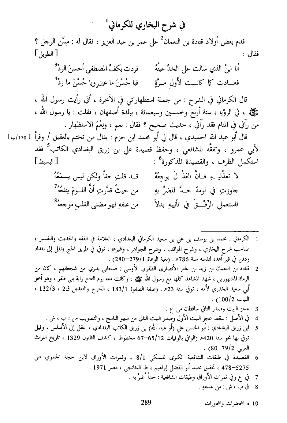 [1] الكرماني: محمد بن يوسف بن علي بن سعيد الكرماني البغدادي، العلامة في الفقه والحديث والتفسير، صاحب شرح البخاري، وشرح المواقف، وشرح الجواهر، وغيرها، توفي في طريق الحج ونقل إلى بغداد ودفن في قبر أعده لنفسه سنة 786 هـ. (بغية الوعاة 1/279- 280) .