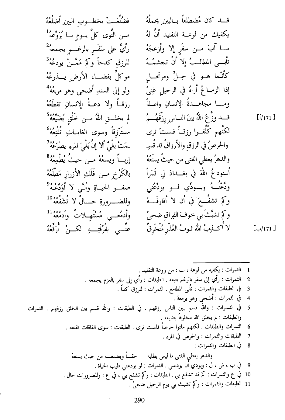 [5] في الثمرات: والله قسم بين الناس رزقهم. في الطبقات: والله قسم بين الخلق رزقهم. الثمرات والطبقات: لم يخلق الله مخلوقا يضيعه.