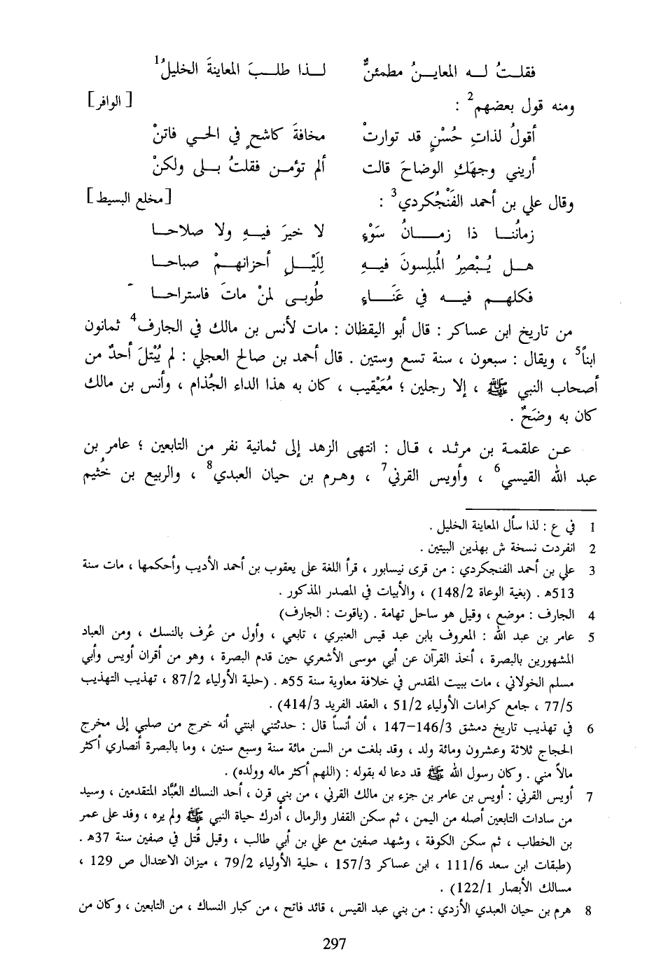 [5] عامر بن عبد الله: المعروف بابن عبد قيس العنبري، تابعي، وأول من عرف بالنسك، ومن العباد المشهورين بالبصرة، أخذ القرآن عن أبي موسى الأشعري حين قدم البصرة، وهو من أقران أويس وأبي مسلم الخولاني، مات ببيت المقدس في خلافة معاوية سنة 55 هـ. (حلية الأولياء 2/87، تهذيب التهذيب 5/77، جامع كرامات الأولياء 2/51، العقد الفريد 3/414) .
