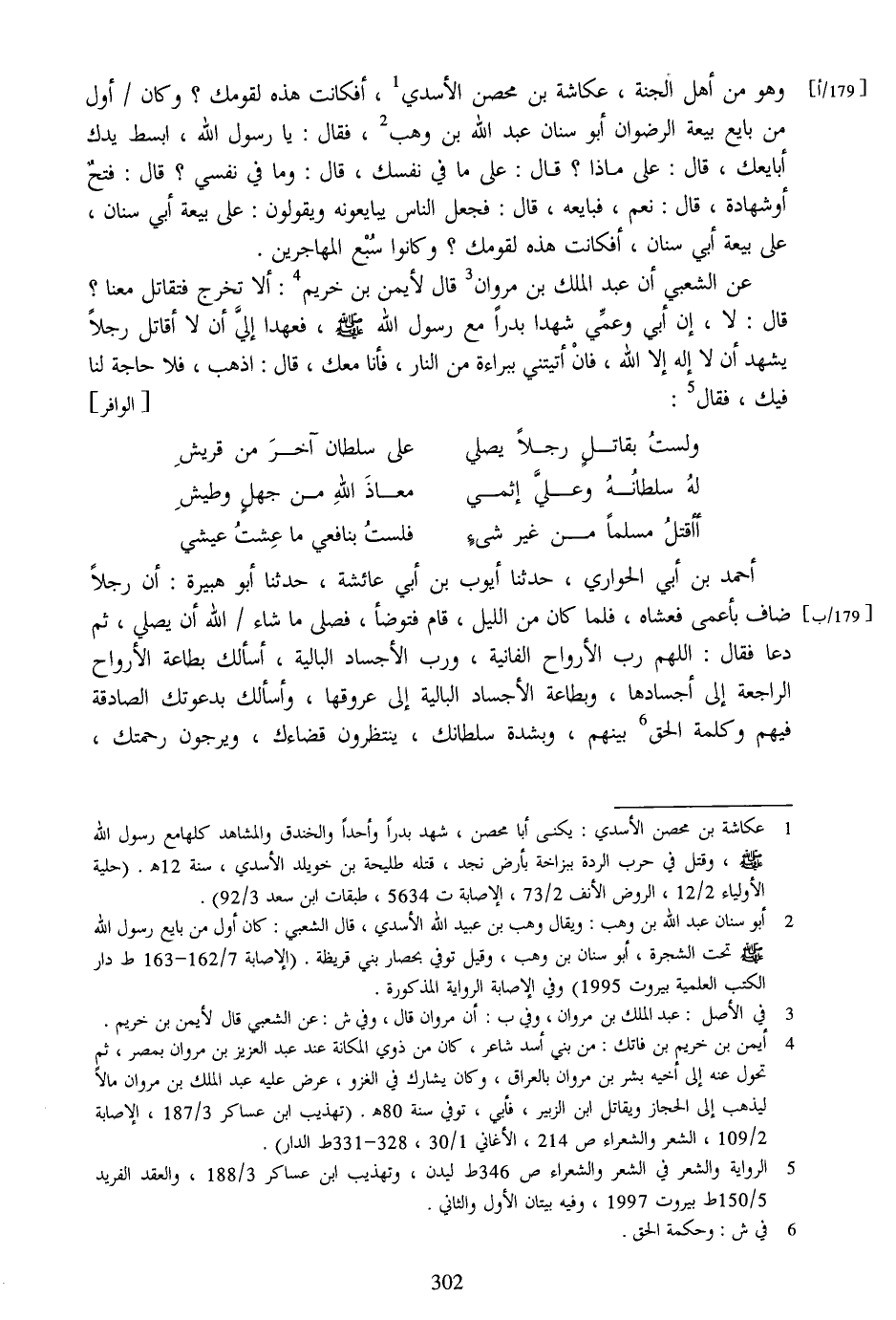 [2] أبو سنان عبد الله بن وهب: ويقال وهب بن عبيد الله الأسدي، قال الشعبي: كان أول من بايع رسول الله صلّى الله عليه وسلم تحت الشجرة، أبو سنان بن وهب، وقيل توفي بحصار بني قريظة. (الإصابة 7/162- 163 ط دار الكتب العلمية بيروت 1995) وفي الإصابة الرواية المذكورة.