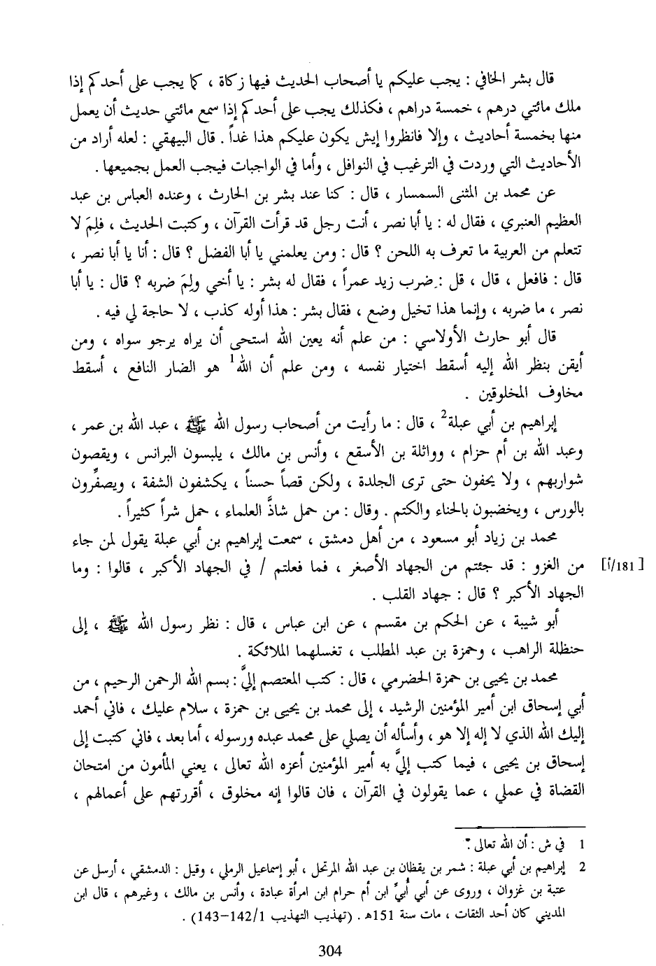قال بشر الحافي: يجب عليكم يا أصحاب الحديث فيها زكاة، كما يجب على أحدكم إذا ملك مائتي درهم، خمسة دراهم، فكذلك يجب على أحدكم إذا سمع مائتي حديث أن يعمل منها بخمسة أحاديث، وإلا فانظروا إيش يكون عليكم هذا غدا. قال البيهقي: لعله أراد من الأحاديث التي وردت في الترغيب في النوافل، وأما في الواجبات فيجب العمل بجميعها.
