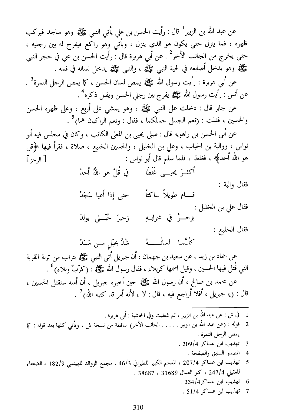 عن عبد الله بن الزبير [1] قال: رأيت الحسن بن علي يأتي النبي صلّى الله عليه وسلم وهو ساجد فيركب ظهره، فما ينزل حتى يكون هو الذي ينزل، ويأتي وهو راكع فيفرج له بين رجليه، حتى يخرج من الجانب الآخر [2] . عن أبي هريرة قال: رأيت الحسن بن علي في حجر النبي صلّى الله عليه وسلم وهو يدخل أصابعه في لحية النبي صلّى الله عليه وسلم، والنبي صلّى الله عليه وسلم يدخل لسانه في فمه.