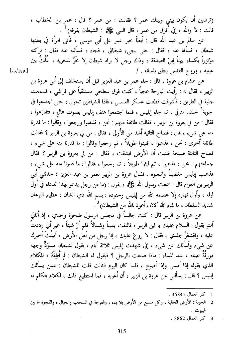 عن هشام بن عروة، قال: جاء عمر بن عبد العزيز قبل أن يستخلف إلى أبي عروة بن الزبير، فقال له: رأيت البارحة عجبا، كنت فوق سطحي مستلقيا على فراشي، فسمعت جلبة في الطريق، فأشرفت فظننت عسكر العسس، فاذا الشياطين تجول، حتى اجتمعوا في جوبة [2] خلف منزلي، ثم جاء إبليس، فلما اجتمعوا هتف إبليس بصوت عال، فتفازعوا، فقال: من لي بعروة بن الزبير، فقالت طائفة منهم: نحن، فذهبوا ورجعوا، وقالوا: ما قدرنا منه على شىء، قال: فصاح الثانية أشد من الأولى، فقال: من لي بعروة بن الزبير؟ فقالت طائفة أخرى: نحن، فذهبوا، فلبثوا طويلا، ثم رجعوا وقالوا: ما قدرنا منه على شيء، فصاح الثالثة صيحة ظننت أن الأرض انشقت، فقال: من لي بعروة بن الزبير؟ فقال جماعتهم: نحن، فذهبوا، ثم لبثوا طويلا، ثم رجعوا، فقالوا: ما قدرنا منه على شيء، فذهب إبليس مغضبا واتبعوه. فقال عروة بن الزبير لعمر بن عبد العزيز: حدثني أبي الزبير بن العوام قال: سمعت رسول الله صلّى الله عليه وسلم، يقول: (ما من رجل يدعو بهذا الدعاء في أول ليله، وأول نهاره إلا عصمه الله من إبليس وجنوده: بسم الله ذي الشان، عظيم البرهان شديد السلطان، ما شاء الله كان، أعوذ بالله من الشيطان) [3] .