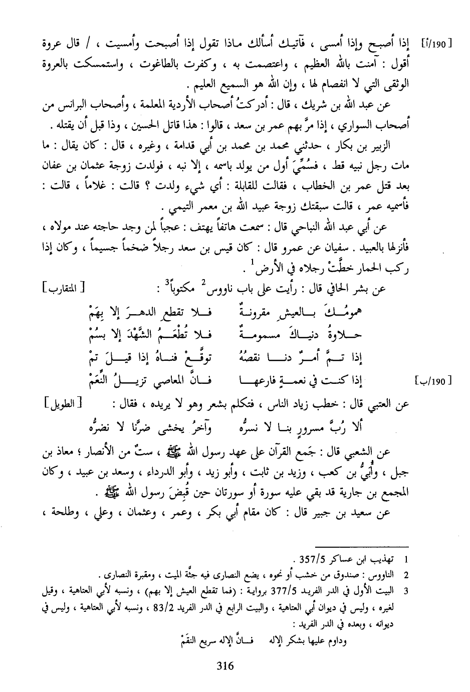 [3] البيت الأول في الدر الفريد 5/377 برواية: (فما تقطع العيش إلا بهم) ، ونسبه لأبي العتاهية، وقيل لغيره، وليس في ديوان أبي العتاهية، والبيت الرابع في الدر الفريد 2/83، ونسبه لأبي العتاهية، وليس في ديوانه، وبعده في الدر الفريد: