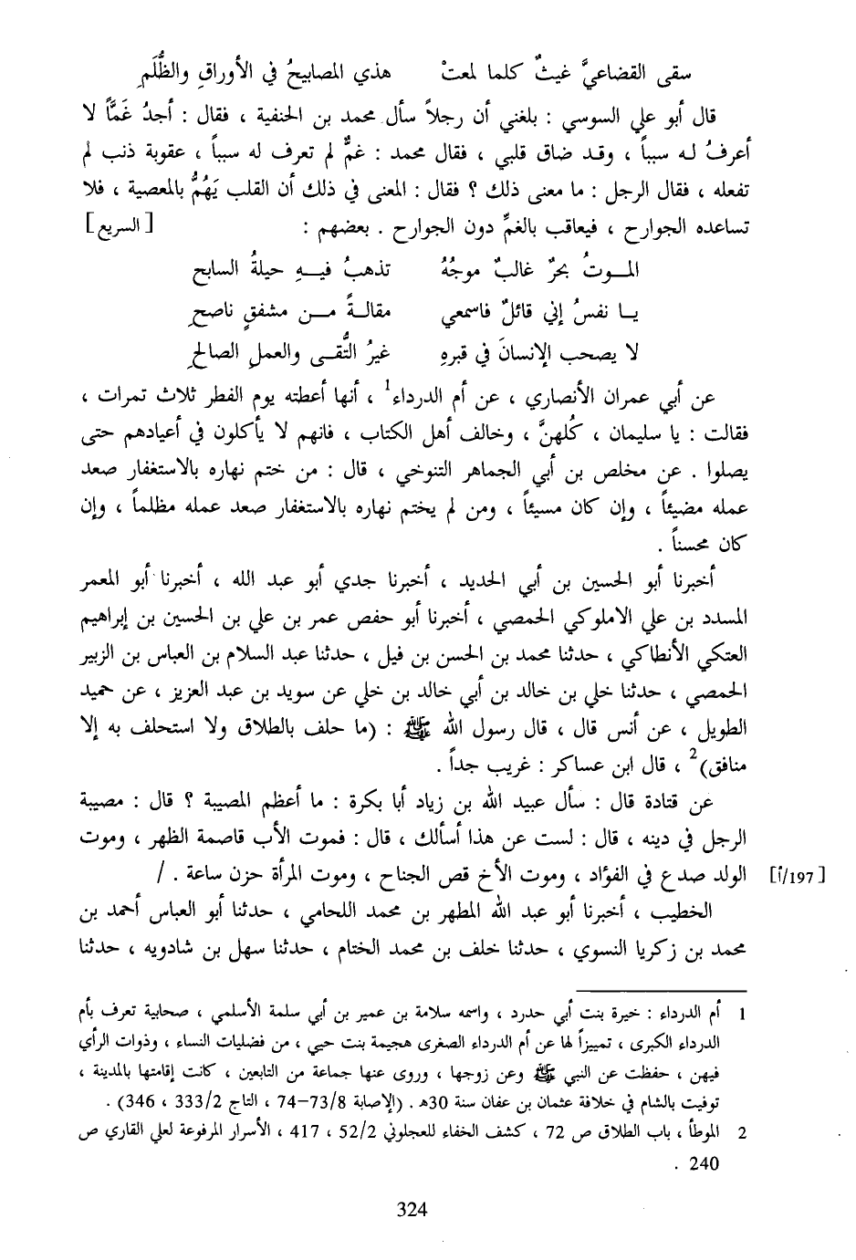 [1] أم الدرداء: خبرة بنت أبي حدرد، واسمه سلامة بن عمير بن أبي سلمة الأسلمي، صحابية تعرف بأم الدرداء الكبرى، تمييزا لها عن أم الدرداء الصغرى هجيمة بنت حيي، من فضليات النساء، وذوات الرأي فيهن، حفظت عن النبي صلّى الله عليه وسلم وعن زوجها، وروى عنها جماعة من التابعين، كانت إقامتها بالمدينة، توفيت بالشام في خلافة عثمان بن عفان سنة 30 هـ. (الإصابة 8/73- 74، التاج 2/333، 346) .
