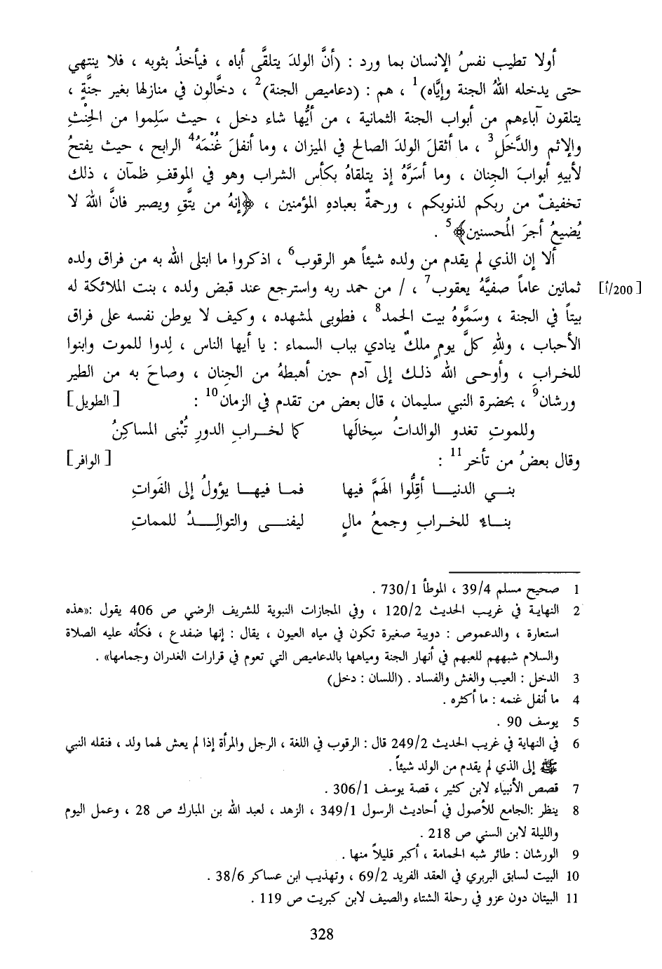 ألا إن الذي لم يقدم من ولده شيئا هو الرقوب [6] ، اذكروا ما ابتلى الله به من فراق ولده ثمانين عاما صفيّه يعقوب [7] ،/من حمد ربه واسترجع عند قبض ولده، بنت الملائكة له بيتا في الجنة، وسمّوه بيت الحمد [8] ، فطوبى لمشهده، وكيف لا يوطن نفسه على فراق الأحباب، ولله كلّ يوم ملك ينادي بباب السماء: يا أيها الناس، لدوا للموت وابنوا للخراب، وأوحى الله ذلك إلى آدم حين أهبطه من الجنان، وصاح به من الطير ورشان [9] ، بحضرة النبي سليمان، قال بعض من تقدم في الزمان [10] : [الطويل]