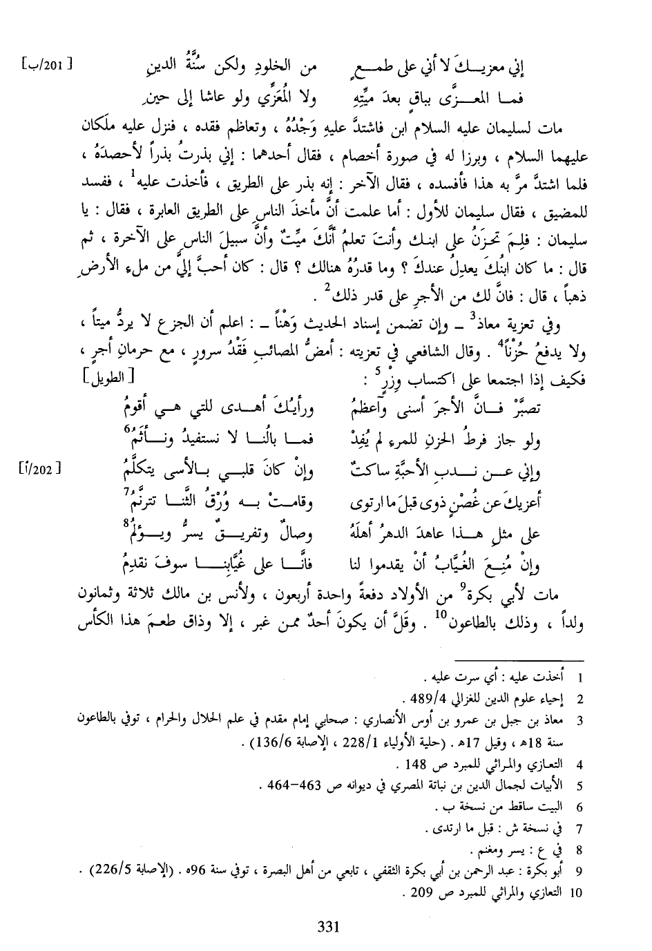 وفي تعزية معاذ [3]- وإن تضمن إسناد الحديث وهنا-: اعلم أن الجزع لا يردّ ميتا، ولا يدفع حزنا [4] . وقال الشافعي في تعزيته: أمضّ المصائب فقد سرور، مع حرمان أجر، فكيف إذا اجتمعا على اكتساب وزر [5] : [الطويل]