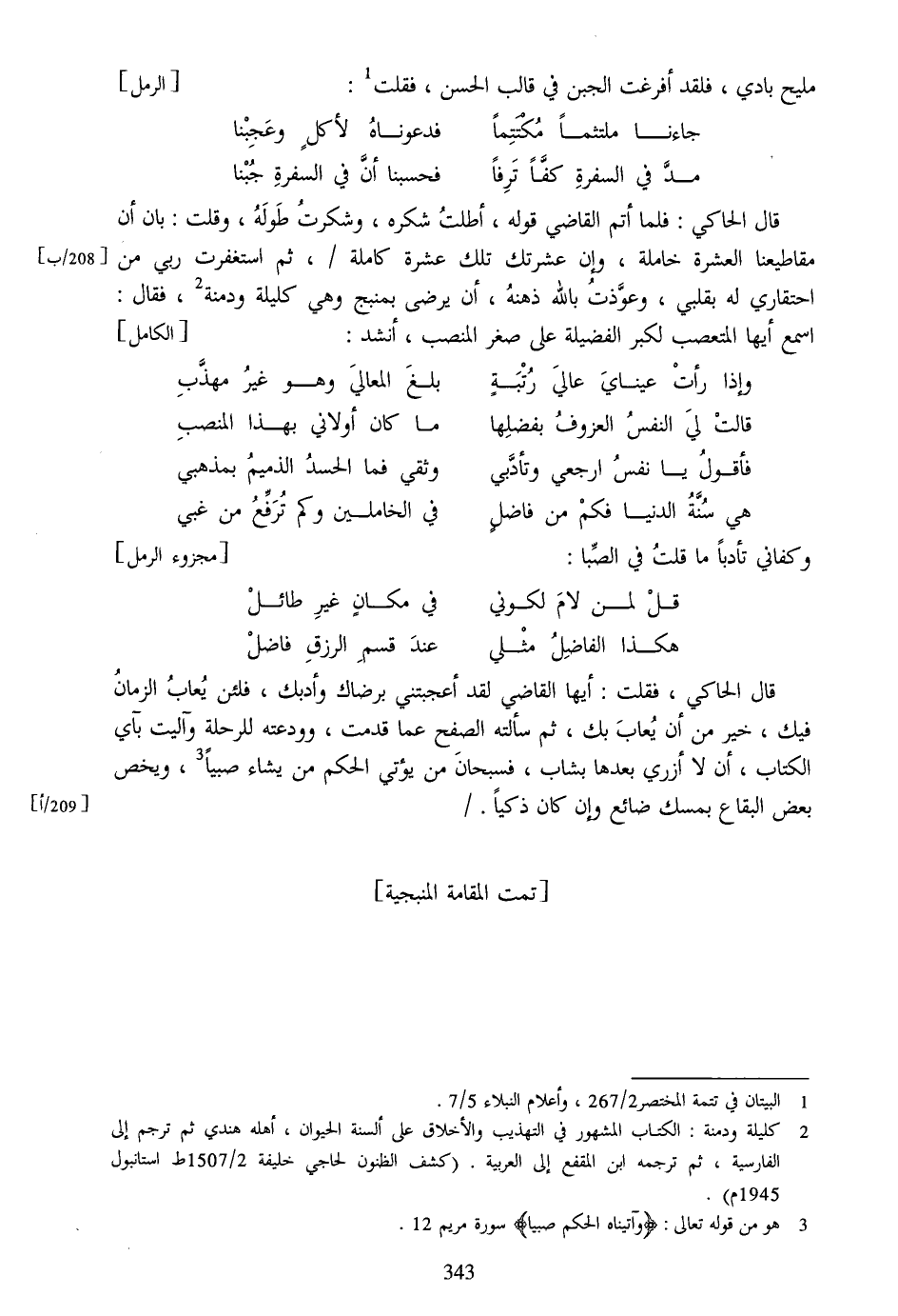 قال الحاكي: فلما أتم القاضي قوله، أطلت شكره، وشكرت طوله، وقلت: بان أن مقاطيعنا العشرة خاملة، وإن عشرتك تلك عشرة كاملة/، ثم استغفرت ربي من احتقاري له بقلبي، وعوّذت بالله ذهنه، أن يرضى بمنبج وهي كليلة ودمنة [2] ، فقال: