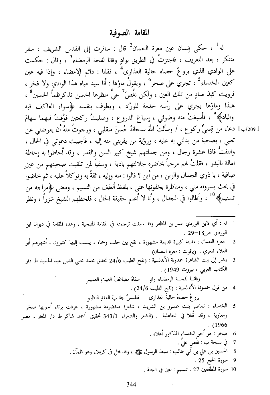 [9] ، فأسبغت منه وضوئي، إسباغ الدروع، وصليت ركعتين فوّقت فيهما سهام دعاء من قسيّ ركوع،/ وسألت الله سبحانه حسن منقلبي، ورجوت منه أن يعوضني عن تعبي، بصحبة من يدلني به عليه، ورؤية من يقربني منه إليه، فأجيبت دعوتي في الحال، والتفتّ فاذا عشرة رجال، ومن جملتهم شيخ كبير السن والقدر، وقد أحاطوا به إحاطة الهالة بالبدر، فقلت لهم مرحبا بحاضرة جلالتهم بادية، وسقيا لمن تلقيت صحبتهم من عين صافية، يا ذوي الجمال والزين، من أين؟ قالوا: منه وإليه، ثقة به وتوكلا عليه، ثم خاضوا في بحث يسرونه مني، ومناظرة يخفونها عني، بلفظ ألطف من النسيم، ومعنى مِزاجُهُ مِنْ تَسْنِيمٍ