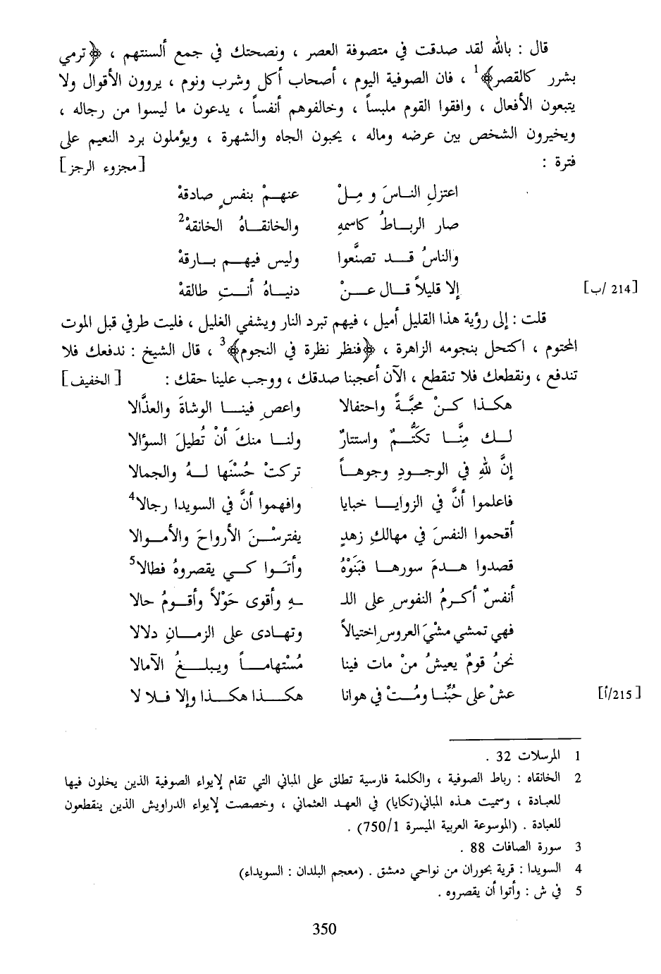 [1] ، فان الصوفية اليوم، أصحاب أكل وشرب ونوم، يروون الأقوال ولا يتبعون الأفعال، وافقوا القوم ملبسا، وخالفوهم أنفسا، يدعون ما ليسوا من رجاله، ويخيرون الشخص بين عرضه وماله، يحبون الجاه والشهرة، ويؤملون برد النعيم على فترة: [مجزوء الرجز]