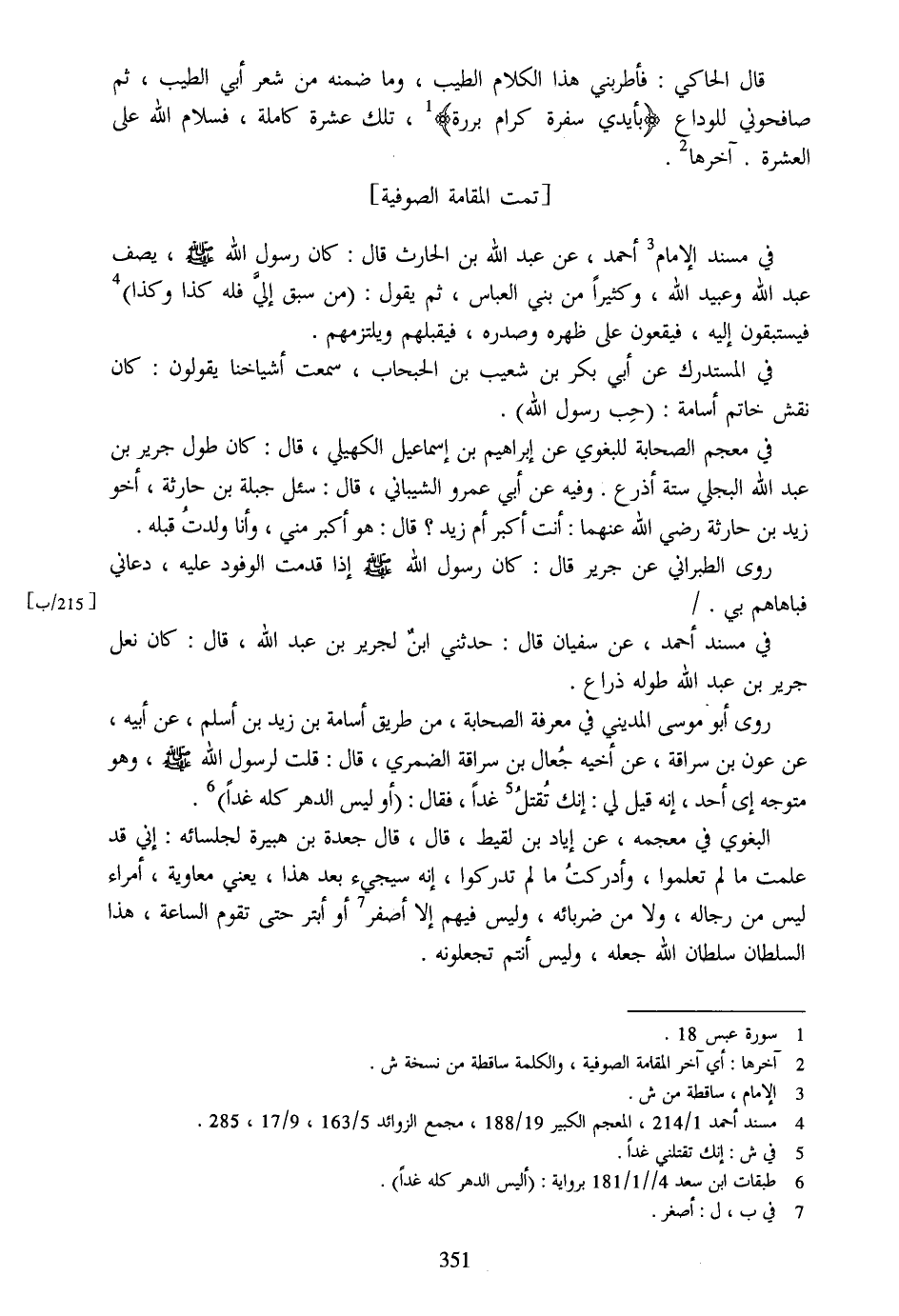 [تمت المقامة الصوفية] في مسند الإمام [3] أحمد، عن عبد الله بن الحارث قال: كان رسول الله صلّى الله عليه وسلم، يصف عبد الله وعبيد الله، وكثيرا من بني العباس، ثم يقول: (من سبق إليّ فله كذا وكذا) [4] فيستبقون إليه، فيقعون على ظهره وصدره، فيقبلهم ويلتزمهم.