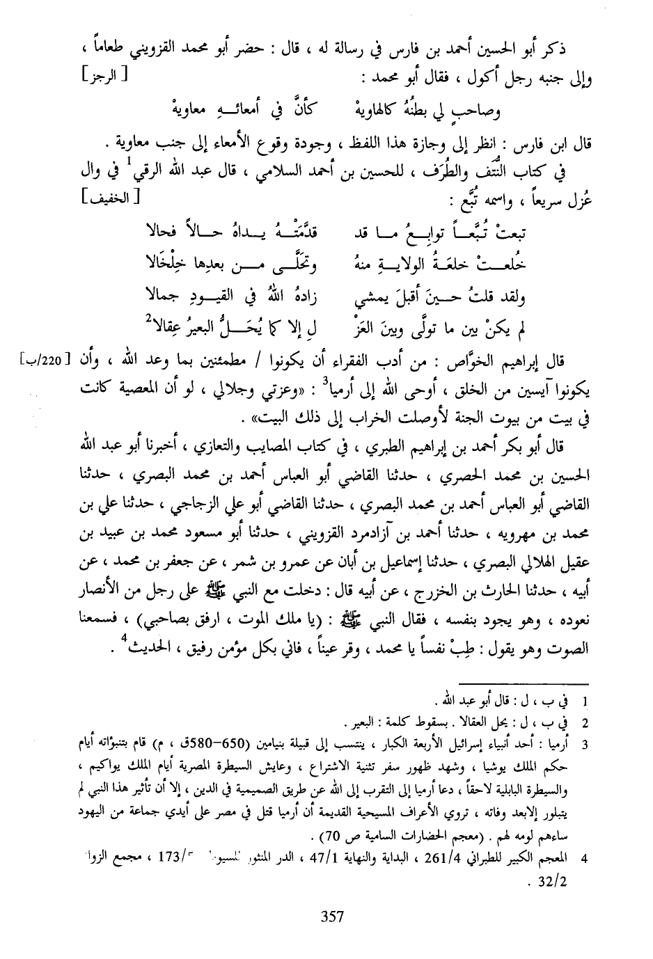 ذكر أبو الحسين أحمد بن فارس في رسالة له، قال: حضر أبو محمد القزويني طعاما، وإلى جنبه رجل أكول، فقال أبو محمد: [الرجز]