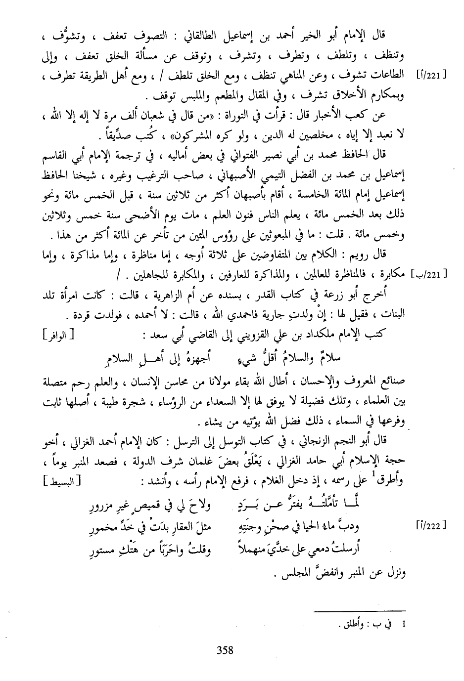 قال الإمام أبو الخير أحمد بن إسماعيل الطالقاني: التصوف تعفف، وتشوّف، وتنظف، وتلطف، وتطرف، وتشرف، وتوقف عن مسألة الخلق تعفف، وإلى الطاعات تشوف، وعن المناهي تنظف، ومع الخلق تلطف/، ومع أهل الطريقة تطرف، وبمكارم الأخلاق تشرف، وفي المقال والمطعم والملبس توقف.