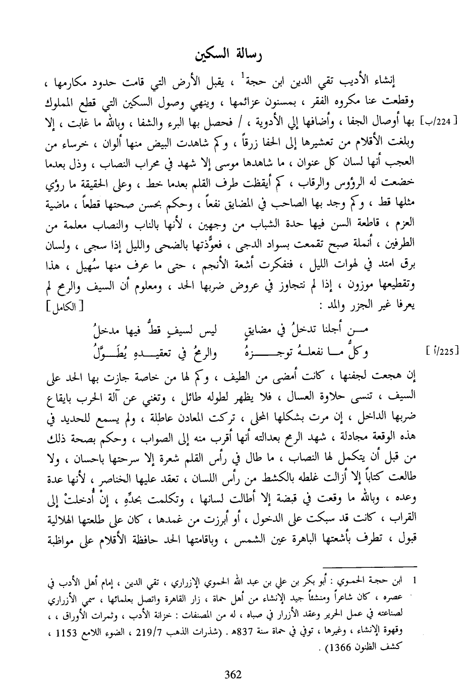 إنشاء الأديب تقي الدين ابن حجة [1] ، يقبل الأرض التي قامت حدود مكارمها، وقطعت عنا مكروه الفقر، بمسنون عزائمها، وينهي وصول السكين التي قطع المملوك بها أوصال الجفا، وأضافها إلي الأدوية،/ فحصل بها البرء والشفا، وبالله ما غابت، إلا وبلغت الأقلام من تعشيرها إلى الحفا زرقا، وكم شاهدت البيض منها ألوان، خرساء من العجب أنها لسان كل عنوان، ما شاهدها موسى إلا شهد في محراب النصاب، وذل بعد ما خضعت له الرؤوس والرقاب، كم أيقظت طرف القلم بعد ما خط، وعلى الحقيقة ما رؤي مثلها قط، وكم وجد بها الصاحب في المضايق نفعا، وحكم بحسن صحتها قطعا، ماضية العزم، قاطعة السن فيها حدة الشباب من وجهين، لأنها بالناب والنصاب معلمة من الطرفين، أنملة صبح تقمعت بسواد الدجى، فعوّذتها بالضحى والليل إذا سجى، ولسان برق امتد في لهوات الليل، فتفكرت أشعة الأنجم، حتى ما عرف منها سهيل، هذا وتقطيعها موزون، إذا لم نتجاوز في عروض ضربها الحد، ومعلوم أن السيف والرمح لم يعرفا غير الجزر والمد: [الكامل]