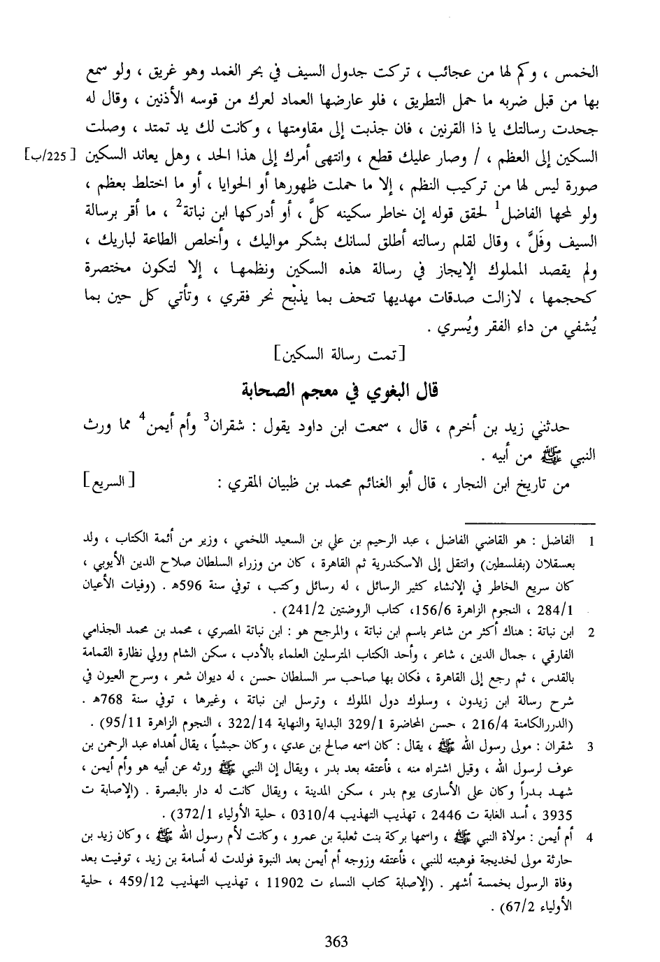 الخمس، وكم لها من عجائب، تركت جدول السيف في بحر الغمد وهو غريق، ولو سمع بها من قبل ضربه ما حمل التطريق، فلو عارضها العماد لعرك من قوسه الأذنين، وقال له جحدت رسالتك يا ذا القرنين، فان جذبت إلى مقاومتها، وكانت لك يد تمتد، وصلت السكين إلى العظم،/ وصار عليك قطع، وانتهى أمرك إلى هذا الحد، وهل يعاند السكين صورة ليس لها من تركيب النظم، إلا ما حملت ظهورها أو الحوايا، أو ما اختلط بعظم، ولو لمحها الفاضل [1] لحقق قوله إن خاطر سكينه كلّ، أو أدركها ابن نباته [2] ، ما أقر برسالة السيف وفلّ، وقال لقلم رسالته أطلق لسانك بشكر مواليك، وأخلص الطاعة لباريك، ولم يقصد المملوك الإيجاز في رسالة هذه السكين ونظمها، إلا لتكون مختصرة كحجمها، لا زالت صدقات مهديها تتحف بما يذبح نحر فقري، وتأتي كل حين بما يشفي من داء الفقر ويسري.