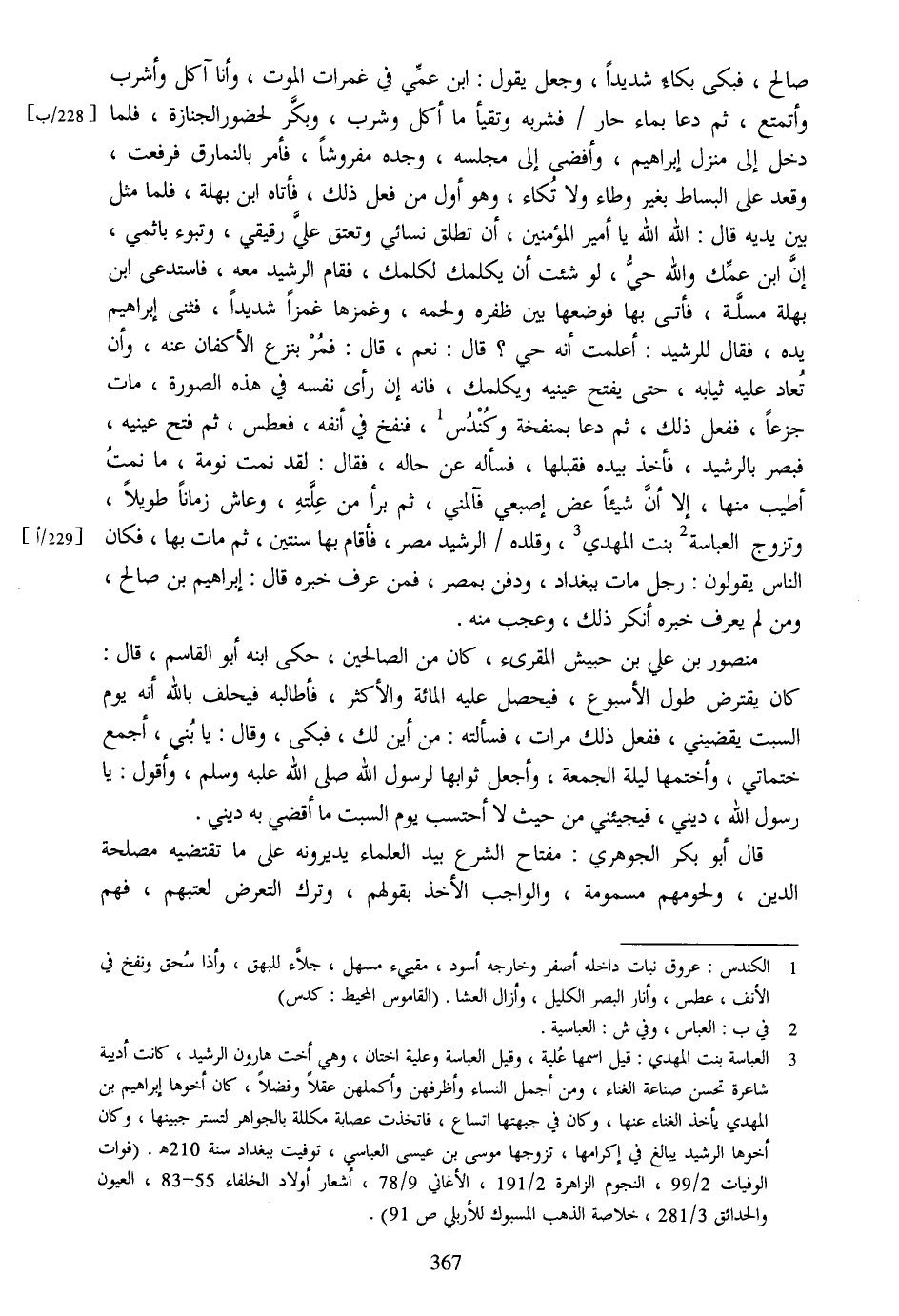 صالح، فبكى بكاء شديدا، وجعل يقول: ابن عمّي في غمرات الموت، وأنا آكل وأشرب وأتمتع، ثم دعا بماء حار/ فشربه وتقيأ ما أكل وشرب، وبكّر لحضور الجنازة، فلما دخل إلى منزل إبراهيم، وأفضى إلى مجلسه، وجده مفروشا، فأمر بالنمارق فرفعت، وقعد على البساط بغير وطاء ولا تكاء، وهو أول من فعل ذلك، فأتاه ابن بهلة، فلما مثل بين يديه قال: الله الله يا أمير المؤمنين، أن تطلق نسائي وتعتق عليّ رقيقي، وتبوء باثمي، إنّ ابن عمّك والله حيّ، لو شئت أن يكلمك لكلمك، فقام الرشيد معه، فاستدعى ابن بهلة مسلّة، فأتى بها فوضعها بين ظفره ولحمه، وغمزها غمزا شديدا، فثنى إبراهيم يده، فقال للرشيد: أعلمت أنه حي؟ قال: نعم، قال: فمر بنزع الأكفان عنه، وأن تعاد عليه ثيابه، حتى يفتح عينيه ويكلمك، فانه إن رأى نفسه في هذه الصورة، مات جزعا، ففعل ذلك، ثم دعا بمنفخة وكندس [1] ، فنفخ في أنفه، فعطس، ثم فتح عينيه، فبصر بالرشيد، فأخذ بيده فقبلها، فسأله عن حاله، فقال: لقد نمت نومة، ما نمت أطيب منها، إلا أنّ شيئا عض إصبعي فآلمني، ثم برأ من علّته، وعاش زمانا طويلا، وتزوج العباسة [2] بنت المهدي [3] ، وقلده/ الرشيد مصر، فأقام بها سنتين، ثم مات بها، فكان الناس يقولون: رجل مات ببغداد، ودفن بمصر، فمن عرف خبره قال: إبراهيم بن صالح، ومن لم يعرف خبره أنكر ذلك، وعجب منه.