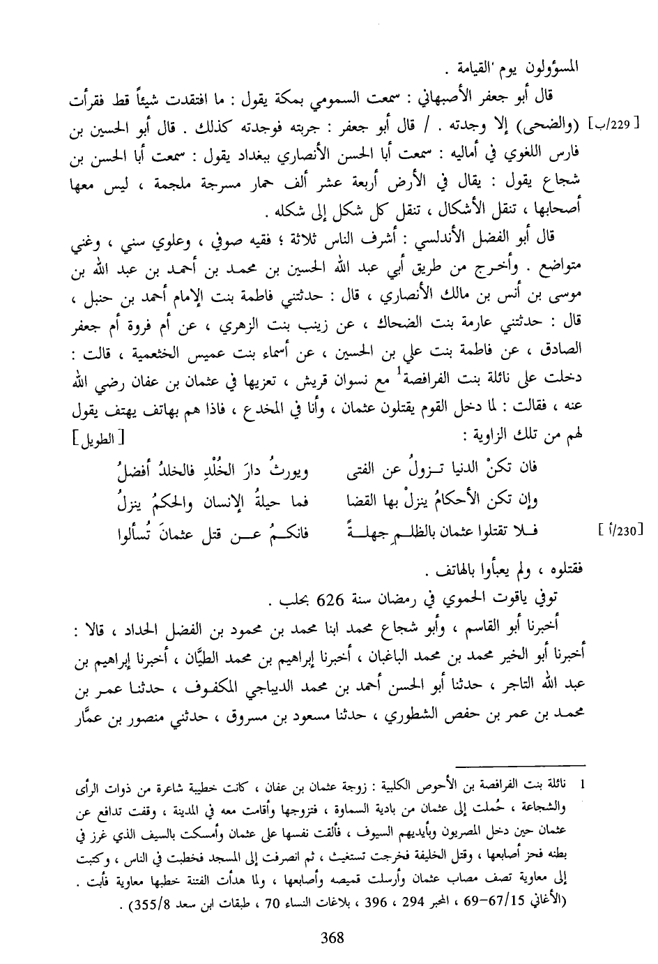 [1] نائلة بنت الفرافصة بن الأحوص الكلبية: زوجة عثمان بن عفان، كانت خطيبة شاعرة من ذوات الرأى والشجاعة، حملت إلى عثمان من بادية السماوة، فتزوجها وأقامت معه في المدينة، وقفت تدافع عن عثمان حين دخل المصريون وبأيديهم السيوف، فألقت نفسها على عثمان وأمسكت بالسيف الذي غرز في بطنه فحز أصابعها، وقتل الخليفة فخرجت تستغيث، ثم انصرفت إلى المسجد فخطبت في الناس، وكتبت إلى معاوية تصف مصاب عثمان وأرسلت قميصه وأصابعها، ولما هدأت الفتنة خطبها معاوية فأبت.