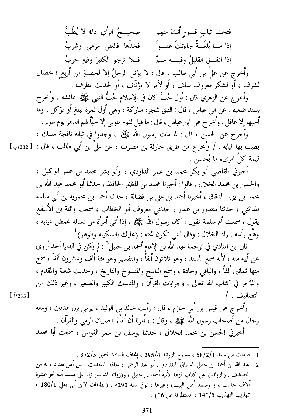[2] عبد الله بن أحمد بن حنبل الشيباني البغدادي: أبو عبد الرحمن، حافظ للحديث، من أهل بغداد، له من التصانيف: (الزوائد) على كتاب الزهد لأبيه أحمد بن حنبل، و (زوائد المسند) زاد على مسند أبيه نحو عشرة آلاف حديث، و (مسند أهل البيت) وغيرها، توفي سنة 290 هـ. (الطبقات لابن أبي يعلي 1/180، تهذيب التهذيب 5/141، المستطرفة ص 16) .