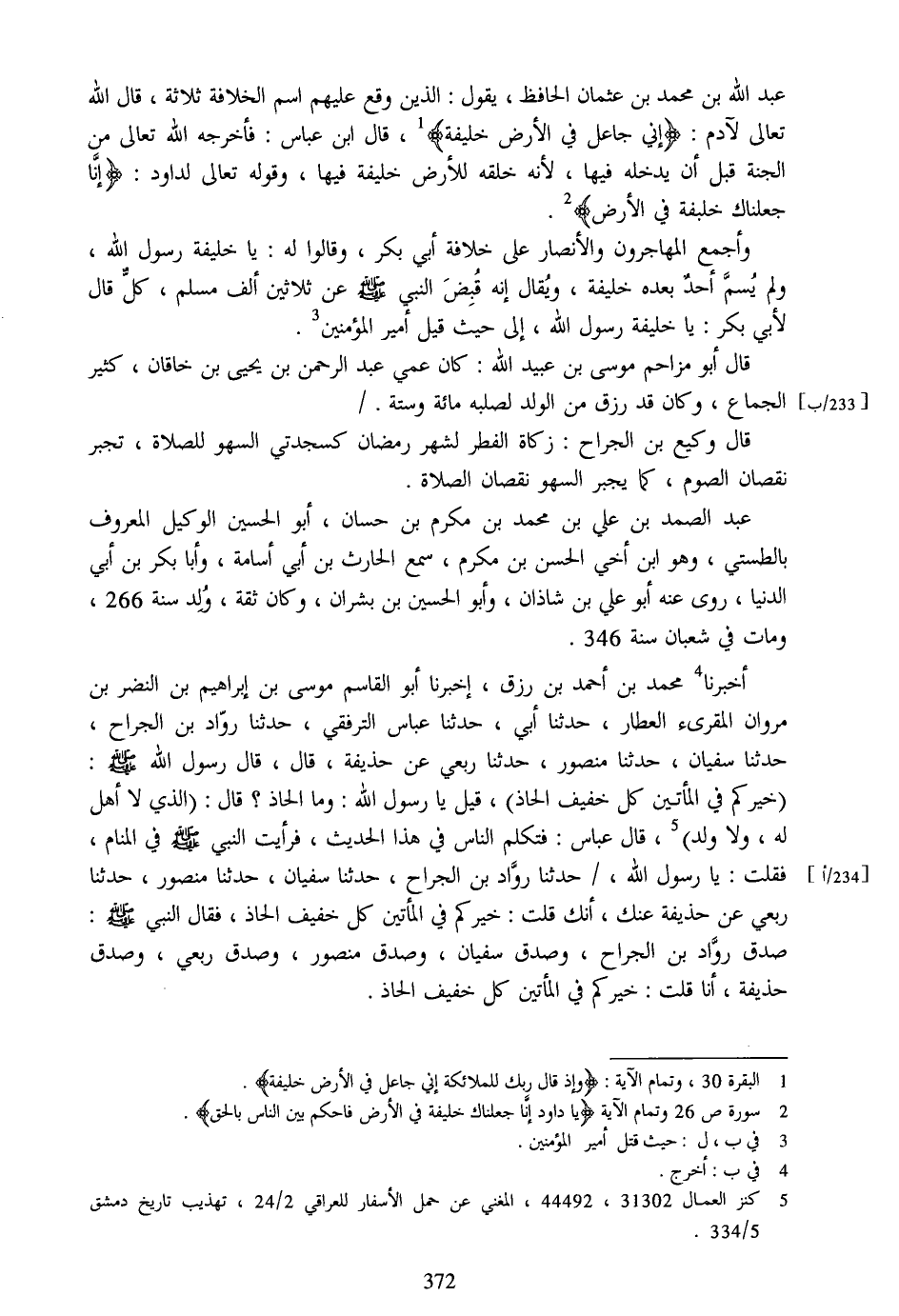 عبد الله بن محمد بن عثمان الحافظ، يقول: الذين وقع عليهم اسم الخلافة ثلاثة، قال الله تعالى لآدم: إِنِّي جاعِلٌ فِي الْأَرْضِ خَلِيفَةً