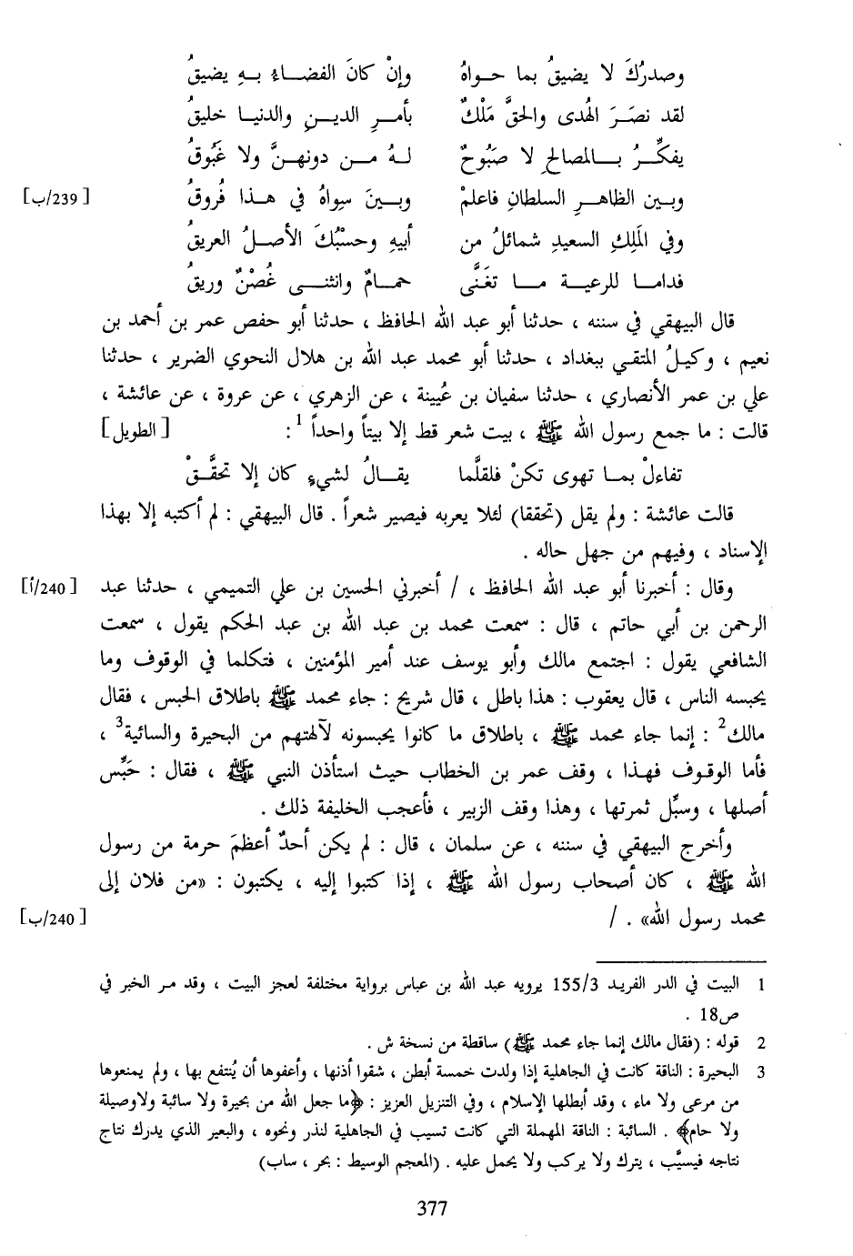 قال البيهقي في سننه، حدثنا أبو عبد الله الحافظ، حدثنا أبو حفص عمر بن أحمد بن نعيم، وكيل المتقي ببغداد، حدثنا أبو محمد عبد الله بن هلال النحوي الضرير، حدثنا علي بن عمر الأنصاري، حدثنا سفيان بن عيينة، عن الزهري، عن عروة، عن عائشة، قالت: ما جمع رسول الله صلّى الله عليه وسلم، بيت شعر قط إلا بيتا واحدا [1] : [الطويل]