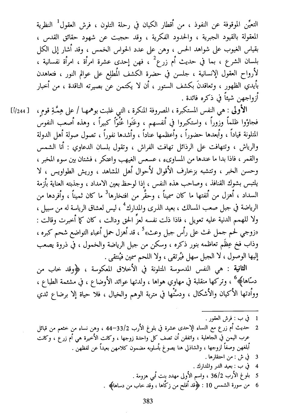 الأولى: هي النفس المستكبرة، المصروفة المنكرة، التي غلبت بوهمها/ على همّة قوم، فجاؤوا ظلما وزورا، واستكبروا في أنفسهم، وعتوا عتوّا كبيرا، وهذه أصعب النفوس المتلونة قيادا، وأبعدها حضورا، وأعظمها عنادا، وأشدها نفورا، تصول صولة أهل الدولة والرياش، وتتهافت على الرذائل تهافت الفراش، وتقول بلسان الدعاوي: أنا الشمس والقمر، فاذا بدا ما عندها من المساوئ، عسعس الغيهب واعتكر، فشتان بين سوء المخبر، وحسن الخبر، وتتشبه بزخارف الأقوال لأحوال أهل المشاهد، وريش الطواويس، لا يلتبس بشوك القنافذ، وصاحب هذه النفس، إذا لوحظ بعين الامداد، وجذبته العناية بأزمة السداد، أهزل من أنفتها ما كان سمينا، وحقّر من افتخارها [3] ما كان ثمينا، وأفردها من الرياضة في جبل صعب المسالك، بعيد الذرى والمدارك [4] ، ليس لعشاق الرياسة له من سبيل، ولا للهمم الدنية عليه تعويل، فاذا ذلت نفسه لعزّ الحق ودالت، كان كما أخبرت وقالت: