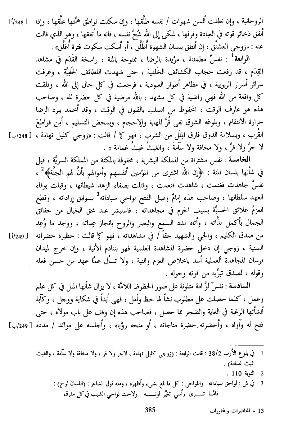 [2] ، نفس جاهدت فغنمت، شاهدت فنعمت، وقتلت بصفاء الزهد شيطانها، وقبلت بوفاء العهد سلطانها، وصاحب هذه إمام وصل الفتح لواحي سياداته [3] بسوابق إراداته، وقطع العزم علائق الحسيّة بسيف الحزم في مجاهداته، فاستبشر عند محق الخيال من حقائق الجمال بأكمل لذّاته، وأتاه مدد السمع والبصر والروح بانجاز عداته، ووجد ما وعد من صدق الكليم، والحي والشهيد حقا/ في مشاهداته، فهو كما قالت: حظيرة حضراته السنية، زوجي إن دخل حضرة المشاهدة العلمية فهو بتنادم الأنية، وإن خرج لميدان فرسان المجاهدة العملية أسد باخلاص العزم والنية، ولا تسأل عمّا عهد من حسن فعله وقوله، لصدق تبرّيه من قوته وحوله.