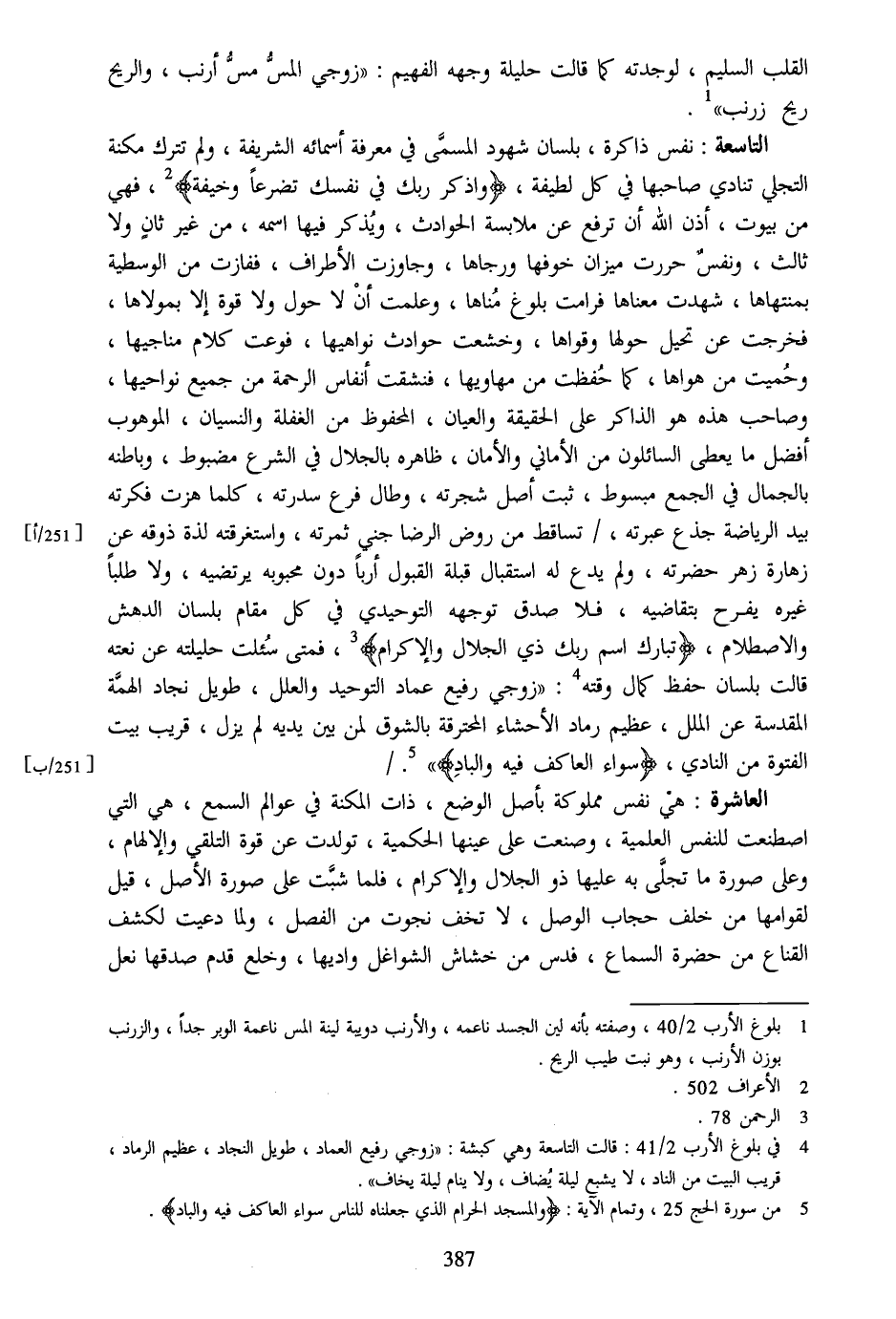 العاشرة: هي نفس مملوكة بأصل الوضع، ذات المكنة في عوالم السمع، هي التي اصطنعت للنفس العلمية، وصنعت على عينها الحكمية، تولدت عن قوة التلقي والإلهام، وعلى صورة ما تجلّى به عليها ذو الجلال والإكرام، فلما شبّت على صورة الأصل، قيل لقوامها من خلف حجاب الوصل، لا تخف نجوت من الفصل، ولما دعيت لكشف القناع من حضرة السماع، فدس من خشاش الشواغل واديها، وخلع قدم صدقها نعل