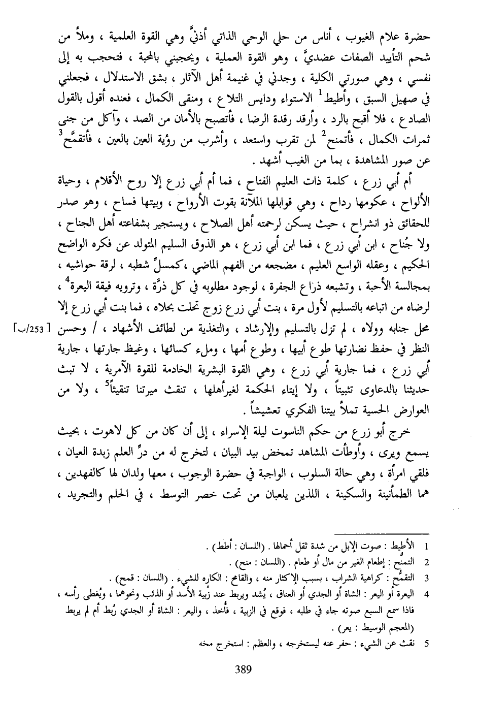 أم أبي زرع، كلمة ذات العليم الفتاح، فما أم أبي زرع إلا روح الأقلام، وحياة الألواح، عكومها رداح، وهي قوابلها الملآنة بقوت الأرواح، وبيتها فساح، وهو صدر للحقائق ذو انشراح، حيث يسكن لرحمته أهل الصلاح، ويستجير بشفاعته أهل الجناح، ولا جناح، ابن أبي زرع، فما ابن أبي زرع، هو الذوق السليم المتولد عن فكره الواضح الحكيم، وعقله الواسع العليم، مضجعه من الفهم الماضي، كمسلّ شطبه، لرقة حواشيه، بمجالسة الأحبة، وتشبعه ذراع الجفرة، لوجود مطلوبه في كل ذرّة، وترويه فيقة اليعرة [4] ، لرضاه من اتباعه بالتسليم لأول مرة، بنت أبي زرع زوج تحلت بحلاه، فما بنت أبي زرع إلا محل جنابه وولاه، لم تزل بالتسليم والإرشاد، والتغذية من لطائف الأشهاد،/ وحسن النظر في حفظ نضارتها طوع أبيها، وطوع أمها، وملء كسائها، وغيظ جارتها، جارية أبي زرع، فما جارية أبي زرع، وهي القوة البشرية الخادمة للقوة الآمرية، لا تبث حديثنا بالدعاوى تثبيتا، ولا إيتاء الحكمة لغير أهلها، تنقث ميرتنا تنقيثا [5] ، ولا من العوارض الحسية تملأ بيتنا الفكري تعشيشا.