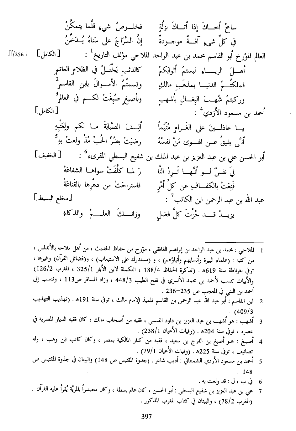 [1] الملاحي: محمد بن عبد الواحد بن إبراهيم الغافقي، مؤرخ من حفاظ الحديث، من أهل ملاحة بالأندلس، من كتبه: (علماء البيرة وأنسابهم وأنباؤهم) ، و (مستدرك على الاستيعاب) ، و (فضائل القرآن) وغيرها، توفي بغرناطة سنة 619 هـ. (تذكرة الحفاظ 4/188، التكملة لابن الأبار 1/325، المغرب 2/126) والأبيات تنسب لأحمد بن محمد الألبيري في نفح الطيب 3/448، وزاد المسافر ص 113، وتنسب إلى أحمد بن البني في المعجب ص 235- 236.