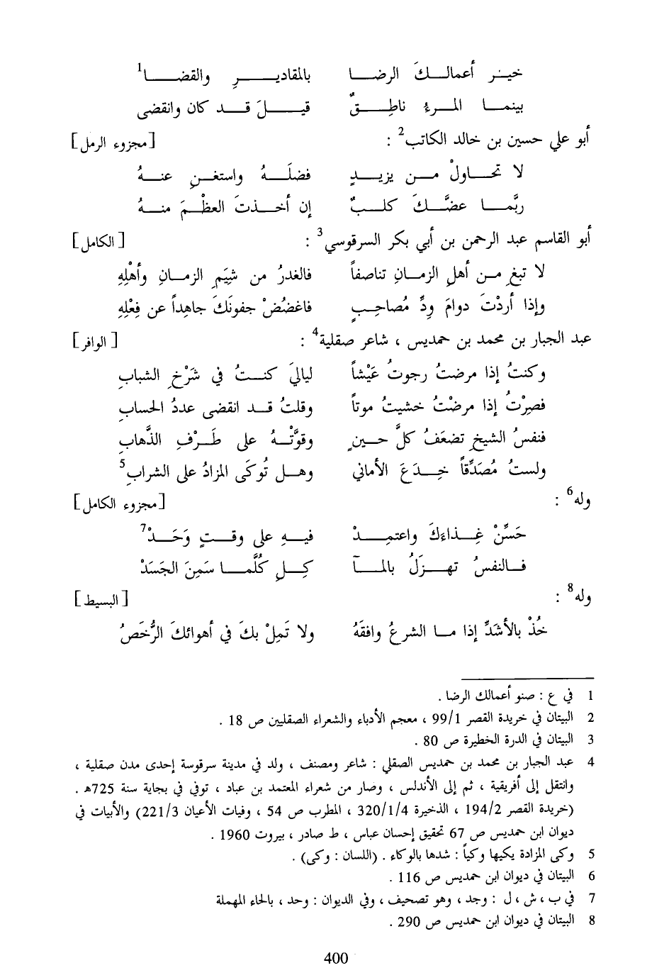 [4] عبد الجبار بن محمد بن حمديس الصقلي: شاعر ومصنف، ولد في مدينة سرقوسة إحدى مدن صقلية، وانتقل إلى أفريقية، ثم إلى الأندلس، وصار من شعراء المعتمد بن عباد، توفي في بجاية سنة 725 هـ.