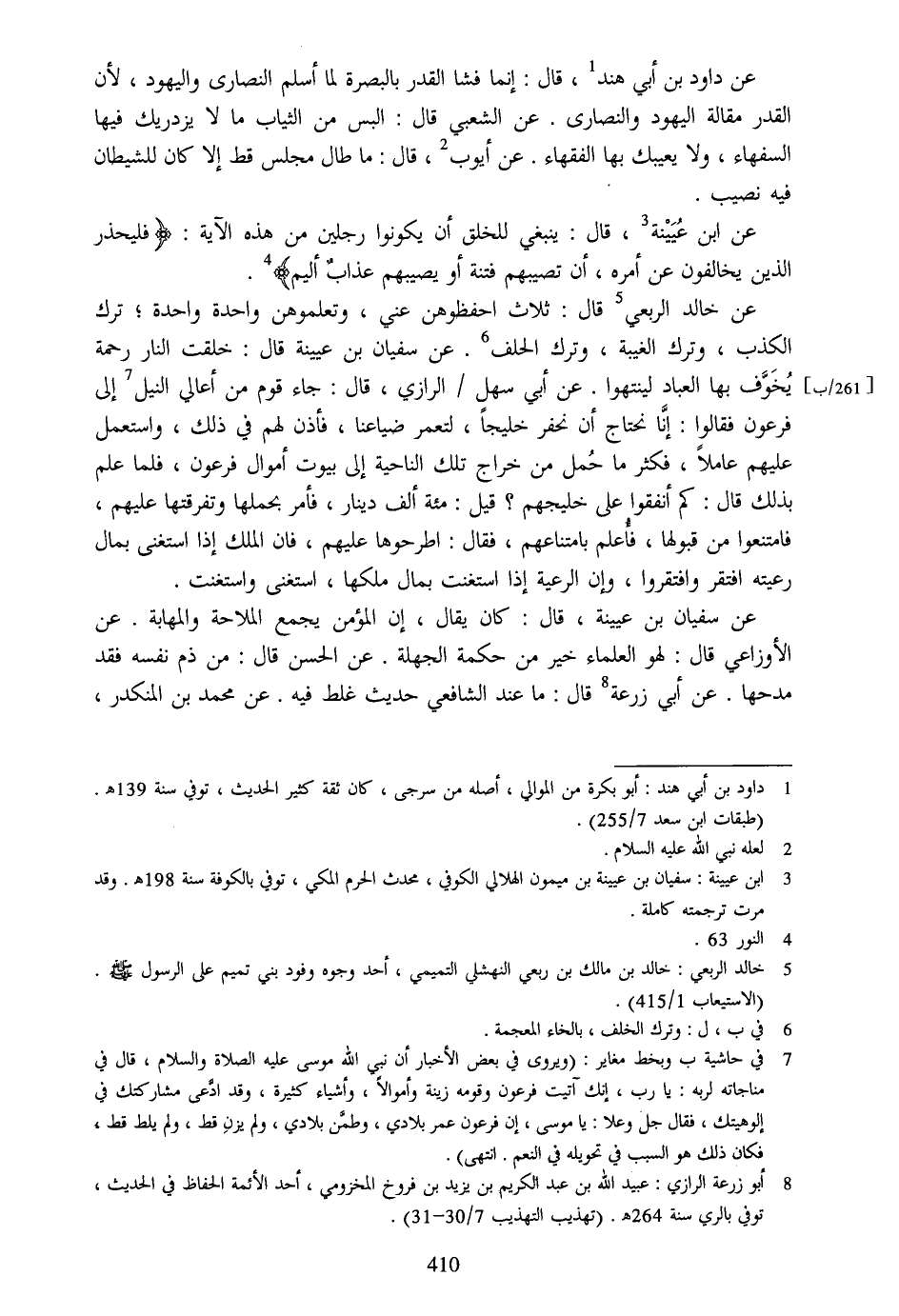[8] أبو زرعة الرازي: عبيد الله بن عبد الكريم بن يزيد بن فروخ المخزومي، أحد الأئمة الحفاظ في الحديث، توفي بالري سنة 264 هـ. (تهذيب التهذيب 7/30- 31) .