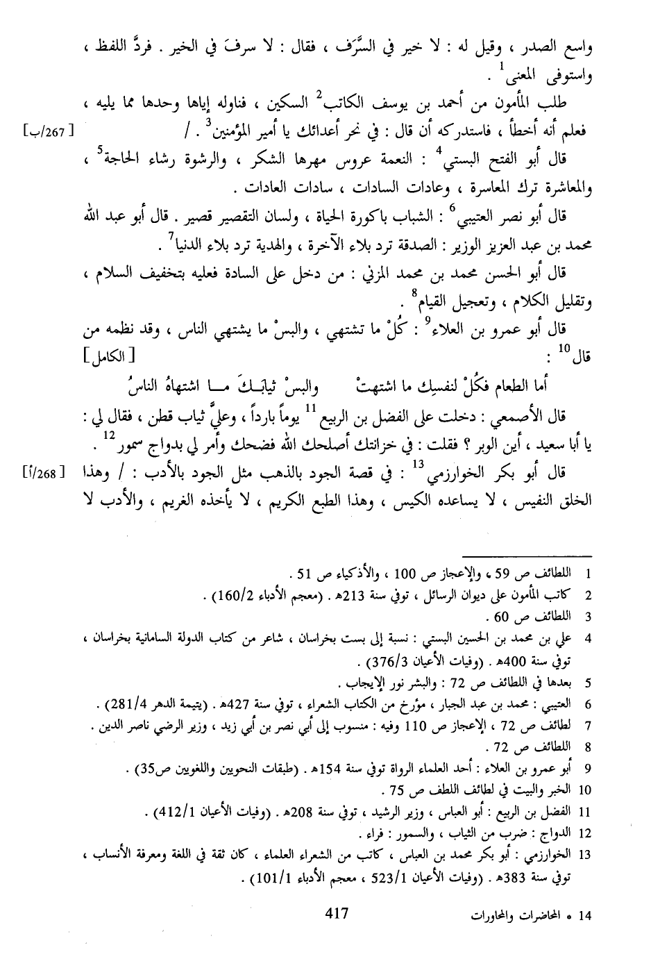 [13] الخوارزمي: أبو بكر محمد بن العباس، كاتب من الشعراء العلماء، كان ثقة في اللغة ومعرفة الأنساب، توفي سنة 383 هـ. (وفيات الأعيان 1/523، معجم الأدباء 1/101) .