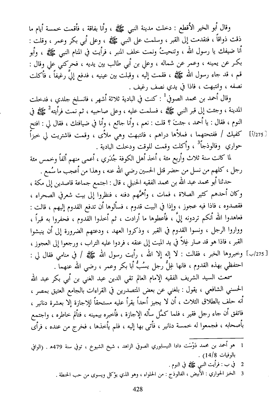 وقال أحمد بن محمد الصوفي [1] : كنت في البادية ثلاثة أشهر، فانسلخ جلدي، فدخلت المدينة، وجئت إلى قبر النبي صلّى الله عليه وسلم، فسلمت عليه، وعلى صاحبيه، ثم نمت فرأيته [2] صلّى الله عليه وسلم في النوم، فقال: يا أحمد، جئت؟ قلت: نعم، وأنا جائع، وأنا في ضيافتك، فقال لي: افتح كفيك/ ففتحتهما، فملأها دراهم، فانتبهت وهي ملأى، وقمت فاشتريت لي خبزا حواري وفالوذجا [3] ، وأكلت وقمت للوقت ودخلت البادية.