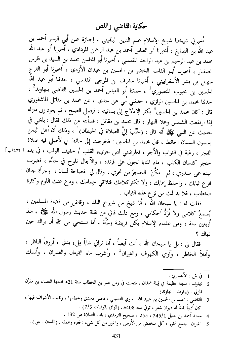 أخبرني شيخنا شيخ الإسلام علم الدين البلقيني، إجازة عن أبي اليسر أحمد بن عبد الله بن الصايغ، أخبرنا أبو العباس أحمد بن عبد الرحمن المردادي، أخبرنا أبو عبد الله محمد بن عبد الرحيم بن عبد الواحد المقدسي، أخبرنا أبو المحاسن محمد بن السيد بن فارس الصفار، أخبرنا أبو القاسم الخضر بن الحسين بن عبدان الأزدي، أخبرنا أبو الفرج سهل بن بشر الأسفراييني، أخبرنا مشرف بن المرجى المقدسي، حدثنا أبو عبد الله الحسين بن محبوب المنصوري [1] ، حدثنا أبو العباس أحمد بن الحسين القاضي بنهاوند [2] ، حدثنا محمد بن الحسين الرازي، حدثني أبي عن جدي، عن محمد بن مقاتل الماشغوري قال: كان محمد بن الحسين [3] يكثر الإدلاج إلى بساتينه، فيصلي الصبح، ثم يعود إلى منزله إذا ارتفعت الشمس وعلا النهار، قال محمد بن مقاتل: فسألته عن ذلك فقال: بلغني في حديث عن النبي صلّى الله عليه وسلم أنه قال: (حبّب إليّ الصلاة في الحيطان) [4] ، وذلك أن أهل اليمن يسمون البستان الحائط، قال محمد بن الحسين: فخرجت إلى حائط لي لأصلي فيه صلاة الفجر، رغبة في الثواب والأجر، فعارضني لص جريء القلب/ خفيف الوثب، في يده خنجر كلسان الكلب، ماء المنايا تجول على فرنده، والآجال تلوح في حدّه، فضرب بيده على صدري، ثم مكّن الخنجر من نحري، وقال لي بفصاحة لسان، وجرأة جنان:
