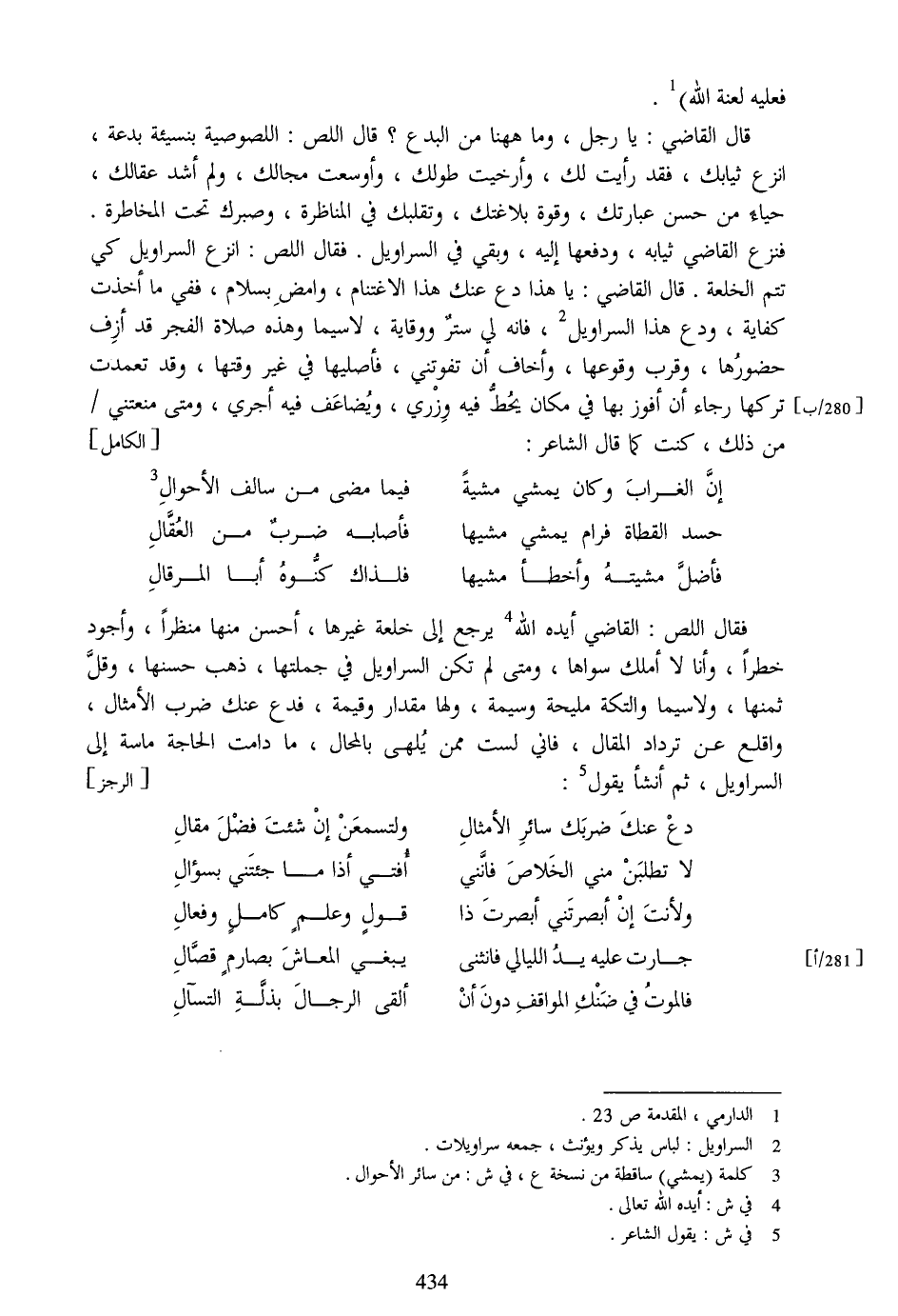 فقال اللص: القاضي أيده الله [4] يرجع إلى خلعة غيرها، أحسن منها منظرا، وأجود خطرا، وأنا لا أملك سواها، ومتى لم تكن السراويل في جملتها، ذهب حسنها، وقلّ ثمنها، ولا سيما والتكة مليحة وسيمة، ولها مقدار وقيمة، فدع عنك ضرب الأمثال، واقلع عن ترداد المقال، فاني لست ممن يلهى بالمحال، ما دامت الحاجة ماسة إلى السراويل، ثم أنشأ يقول [5] : [الرجز]