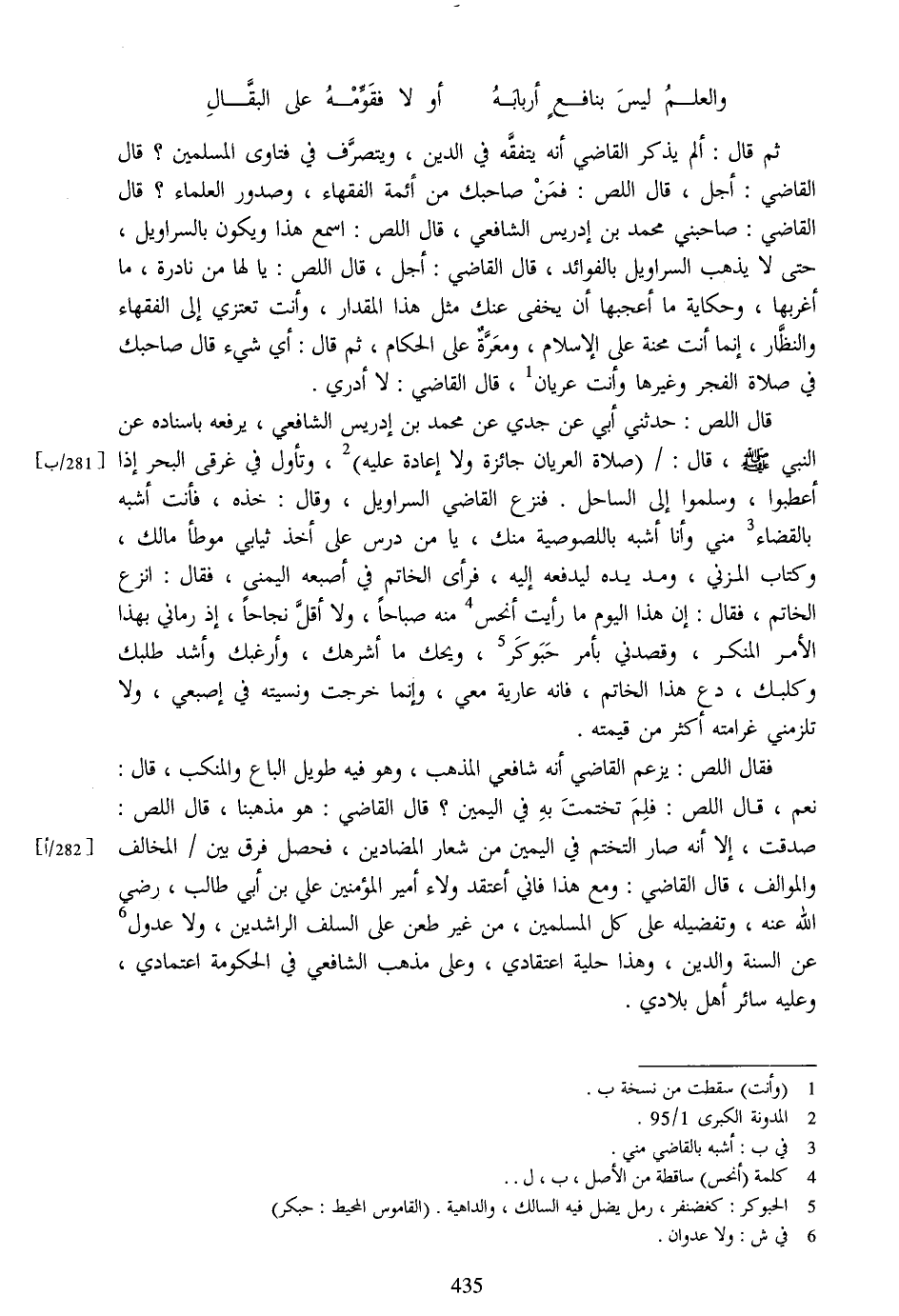 ثم قال: ألم يذكر القاضي أنه يتفقّه في الدين، ويتصرّف في فتاوى المسلمين؟ قال القاضي: أجل، قال اللص: فمن صاحبك من أئمة الفقهاء، وصدور العلماء؟ قال القاضي: صاحبني محمد بن إدريس الشافعي، قال اللص: اسمع هذا ويكون بالسراويل، حتى لا يذهب السراويل بالفوائد، قال القاضي: أجل، قال اللص: يا لها من نادرة، ما أغربها، وحكاية ما أعجبها أن يخفى عنك مثل هذا المقدار، وأنت تعتزي إلى الفقهاء والنظّار، إنما أنت محنة على الإسلام، ومعرّة على الحكام، ثم قال: أي شيء قال صاحبك في صلاة الفجر وغيرها وأنت عريان [1] ، قال القاضي: لا أدري.