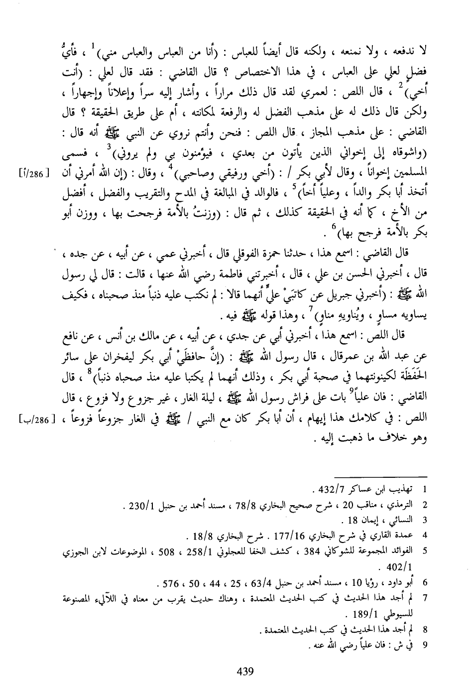 قال اللص: اسمع هذا، أخبرني أبي عن جدي، عن أبيه، عن مالك بن أنس، عن نافع عن عبد الله بن عمر قال، قال رسول الله صلّى الله عليه وسلم: (إنّ حافظي أبي بكر ليفخران على سائر الحفظة لكينونتهما في صحبة أبي بكر، وذلك أنهما لم يكتبا عليه منذ صحباه ذنبا) [8] ، قال القاضي: فان عليا [9] بات على فراش رسول الله صلّى الله عليه وسلم، ليلة الغار، غير جزوع ولا فزوع، قال اللص: في كلامك هذا إيهام، أن أبا بكر كان مع النبي/ صلّى الله عليه وسلم في الغار جزوعا فزوعا، وهو خلاف ما ذهبت إليه.