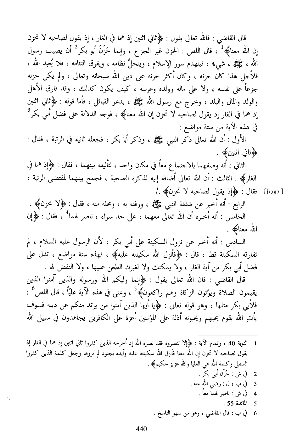 قال القاضي: فالله تعالى يقول: ثانِيَ اثْنَيْنِ إِذْ هُما فِي الْغارِ، إِذْ يَقُولُ لِصاحِبِهِ لا تَحْزَنْ إِنَّ اللَّهَ مَعَنا