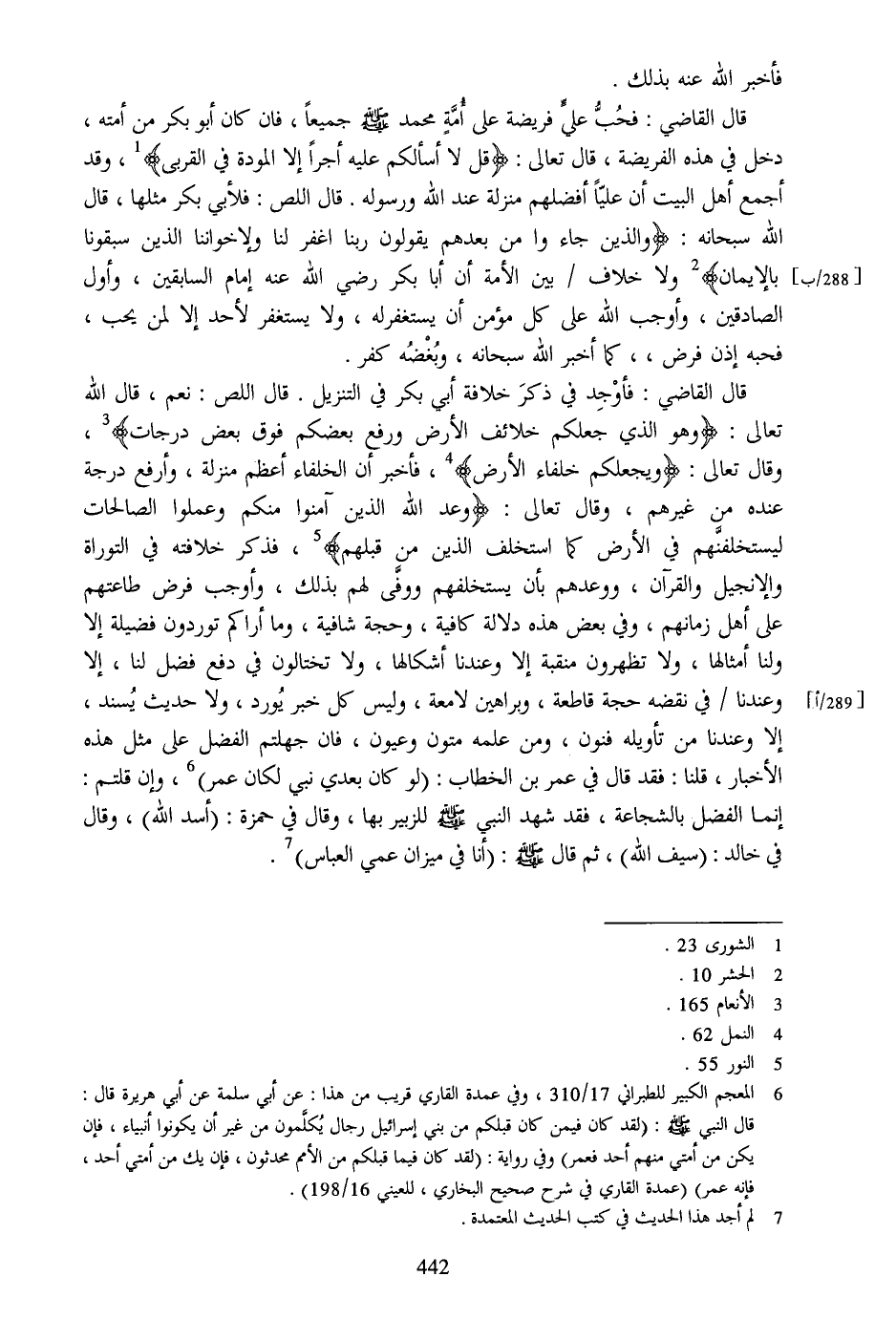 قال القاضي: فحبّ عليّ فريضة على أمّة محمد صلّى الله عليه وسلم جميعا، فان كان أبو بكر من أمته، دخل في هذه الفريضة، قال تعالى: قُلْ لا أَسْئَلُكُمْ عَلَيْهِ أَجْراً إِلَّا الْمَوَدَّةَ فِي الْقُرْبى