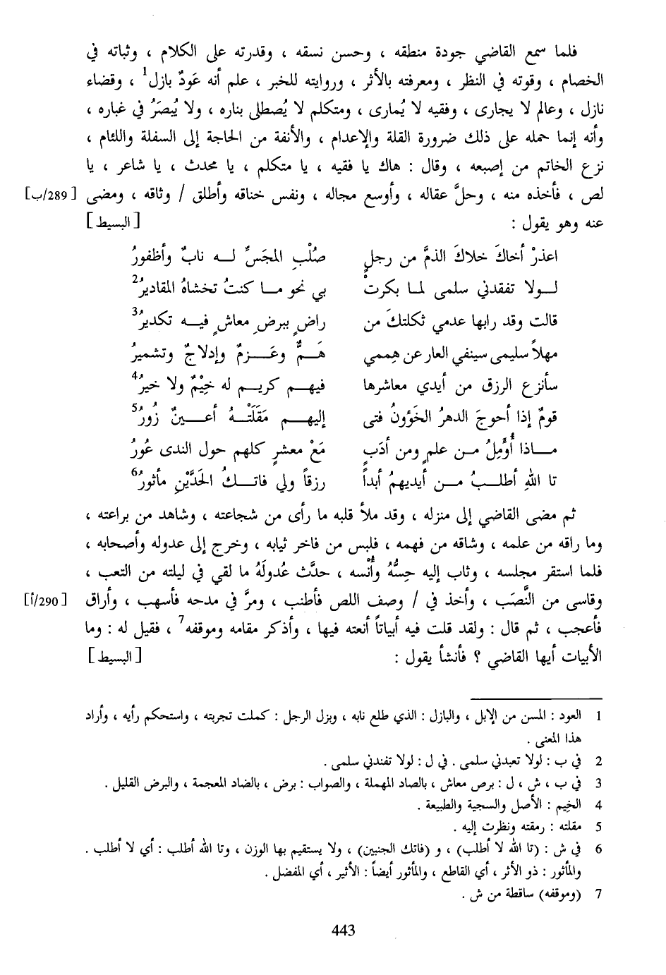 ثم مضى القاضي إلى منزله، وقد ملأ قلبه ما رأى من شجاعته، وشاهد من براعته، وما راقه من علمه، وشاقه من فهمه، فلبس من فاخر ثيابه، وخرج إلى عدوله وأصحابه، فلما استقر مجلسه، وثاب إليه حسّه وأنسه، حدّث عدوله ما لقي في ليلته من التعب، وقاسى من النّصب، وأخذ في/ وصف اللص فأطنب، ومرّ في مدحه فأسهب، وأراق فأعجب، ثم قال: ولقد قلت فيه أبياتا أنعته فيها، وأذكر مقامه وموقفه [7] ، فقيل له: وما الأبيات أيها القاضي؟ فأنشأ يقول: [البسيط]
