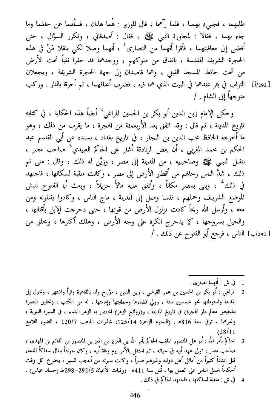 وحكى الإمام زين الدين أبو بكر بن الحسين المراغي [2] أيضا هذه الحكاية، في كتابه تاريخ المدينة، ثم قال: وقد اتفق بعد الأربعمئة من الهجرة، ما يقرب من ذلك، وهو ما أخرجه الحافظ محب الدين بن النجار، في تاريخ بغداد، بسنده عن أبي القاسم عبد الحكم بن محمد المغربي، أن بعض الزنادقة أشار على الحاكم العبيدي [3] صاحب مصر، بنقل النبي صلّى الله عليه وسلم وصاحبيه، من المدينة إلى مصر، وزيّن له ذلك، وقال: متى تم ذلك، شدّ الناس رحالهم من أقطار الأرض إلى مصر، وكانت منقبة لسكانها، فاجتهد في ذلك [4] ، وبنى بمصر مكانا، وأنفق عليه مالا جزيلا، وبعث أبا الفتوح لنبش الموضع الشريف وحملهم، فلما وصل إلى المدينة، ماج الناس، وكادوا يقتلونه ومن معه، وأرسل الله ريحا كادت تزلزل الأرض من قوتها، حتى دحرجت الإبل بأقتابها، والخيل بسروجها، كما يدحرج الكرة على وجه الأرض، وهلك أكثرها، وخلق من الناس، فرجع أبو الفتوح عن ذلك./